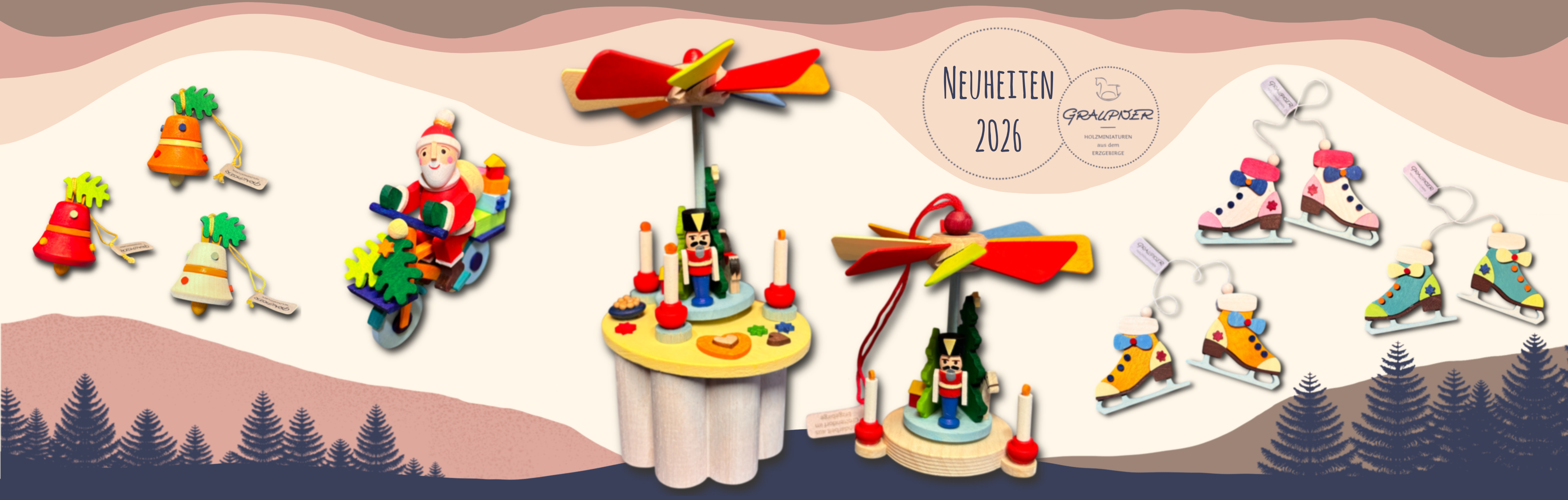 Sie finden in unserem aktuellen Sortiment etwa vierhundert verschiedene Miniaturstücke aus Holz. Dabei ist jedes Produkt in unserem unverwechselbaren Graupner-Stil gestaltet. Der kleinste Baumbehang misst gerade einmal drei Zentimeter. Das aufwendigste Stück aus unserer Manufaktur ist im Gegensatz dazu über dreißig Zentimeter hoch. Die prachtvolle, dreistöckige Pyramide mit dem Motiv der Christgeburt besteht aus über 150, zum Teil winzigen Einzelteilen aus Holz. Unsere moderne Holzkunst aus dem Erzgebirge begleitet Sie rund um das Jahr. Immer neue, innovative Ideen fließen bei der Gestaltung dieser filigranen Kunstwerke ein. So entsteht bei uns auch Holzkunst für Frühling, Ostern, Sommer oder Herbst. Als Dekoration für Ihr Zuhause oder als Mitbringsel zu vielen Anlässen wie Hochzeit, Schulanfang oder Muttertag finden Sie in unserer Kollektion etwas Schönes. Dazu gehört auch Holzkunst aus dem Erzgebirge passend für Ihren Geburtstagstisch. Aber die Hauptsaison für unsere Holzkunstwerke aus dem Erzgebirge ist und bleibt die Weihnachtszeit. Da dreht sich bei uns nicht nur der Nussknacker auf der Pyramide. Auch Engel und Weihnachtsmann schweben als Christbaumschmuck am Tannenbaum. Unsere Holzkunst aus dem Erzgebirge verstärkt den Zauber des Weihnachtsfestes mit Ihrem liebevollen Design. Unterstützung erfährt sie auch durch die Kerzen auf unseren zauberhaften Kerzenhaltern sowie den Räucherkerzen, welche Sie in unseren einzigartigen Räucherhäuschen entzünden können.