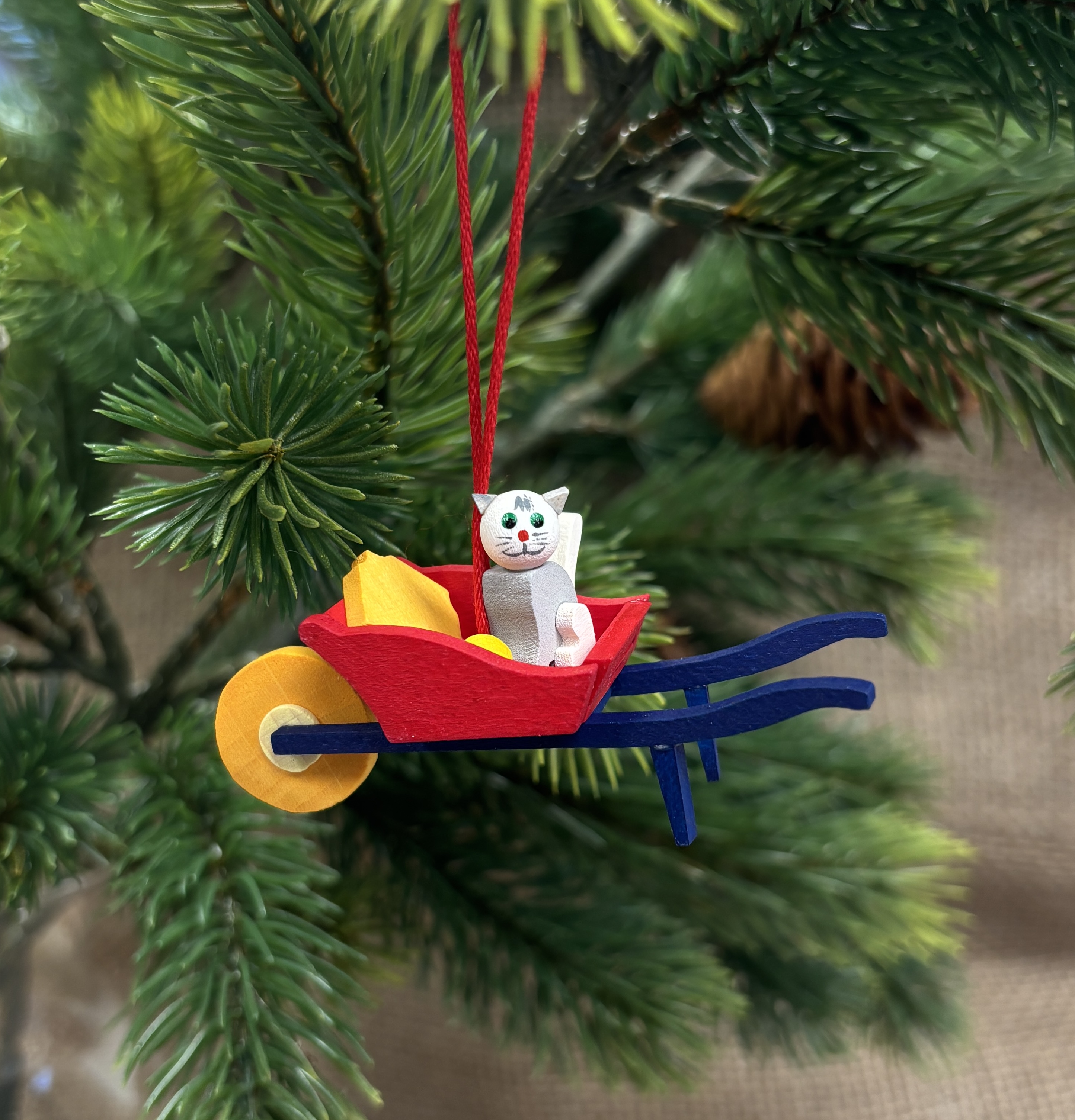 Unsere kleinen Schubkarren mit drei verschiedenen, handbemalten Tieren ist ein echter Hingucker für den Weihnachtsbaum – und dass bei einer Größe von gerade einmal 7 cm. Dieser Baumbehang eignet sich aufgrund seiner Größe nicht nur für den Tannenbaum, sondern auch hervorragend für einen Weihnachtsstrauß oder als Geschenkanhänger auf einem größeren Paket. Der Anhänger ist mit einem roten Faden zum Aufhängen versehen.