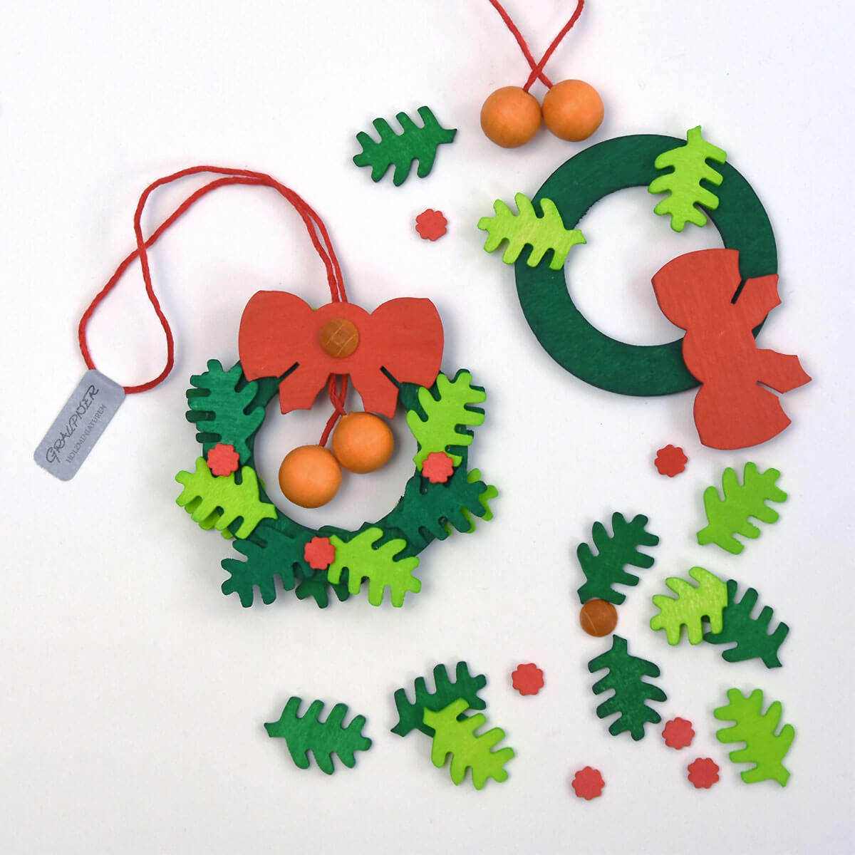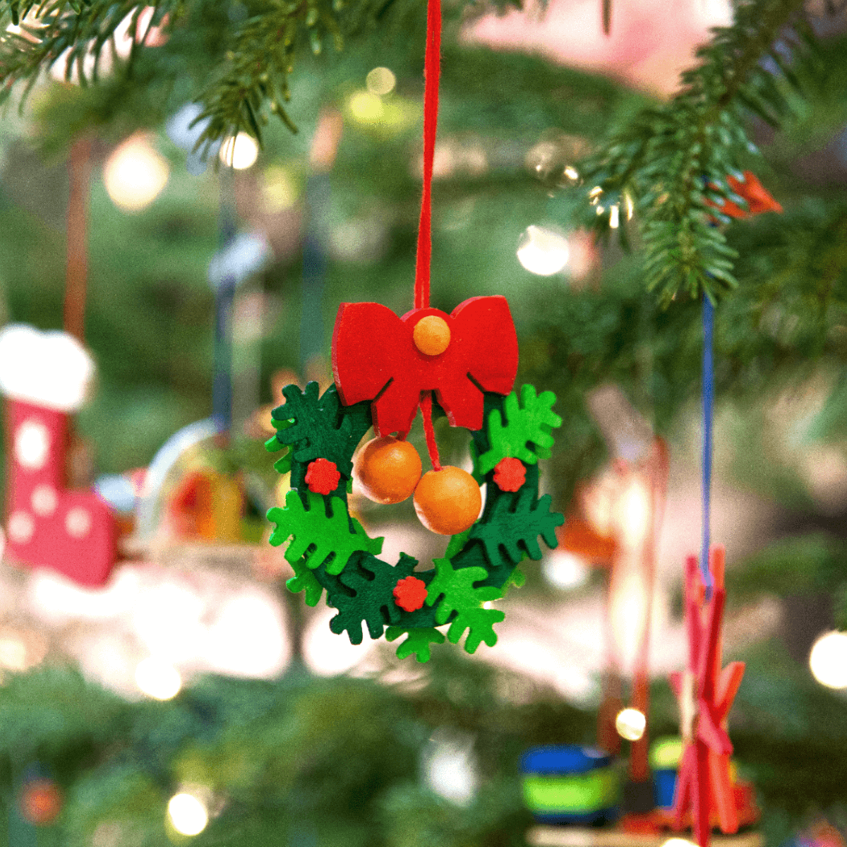 Ganz traditionell und doch besonders – der Adventskranz mit roter Schleife als origineller Christbaumschmuck. Zwei runde Holzkugeln baumeln lustig im Ring. Der Adventskranz eignet sich sowohl für den Tannenbaum als auch den Weihnachtsstrauß. Aber er ist auch als Geschenkanhänger zu verwenden. Das Ornament ist mit einem roten Faden zum Aufhängen versehen.