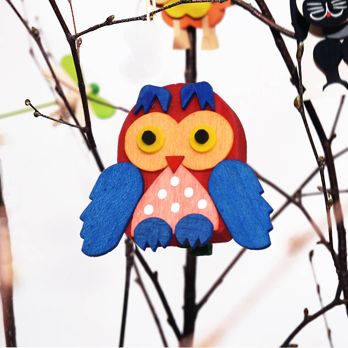 Unsere handbemalten Eulen aus Holz sind eine gelungene Deko – in einer Vielfalt von sechs verschiedenen Farben können Sie sich einen tollen Blickfang für den Frühjahrsstrauß ins Haus holen. Auch fürs Osterfest oder den gesamten Sommer hindurch sind diese von Hand bemalten Stücke ein echter Eyecatcher. Wir fertigen die kleinen Eulen in den Farbkombinationen hellblau-orange, grün-gelb, dunkelblau-rot, rot-gelb, dunkelrot-blau sowie orange-hellblau. Süßer kann Erzgebirge wirklich nicht werden! Jede Eule ist rückseitig mit einer Wäscheklammer zum anknipsen versehen.