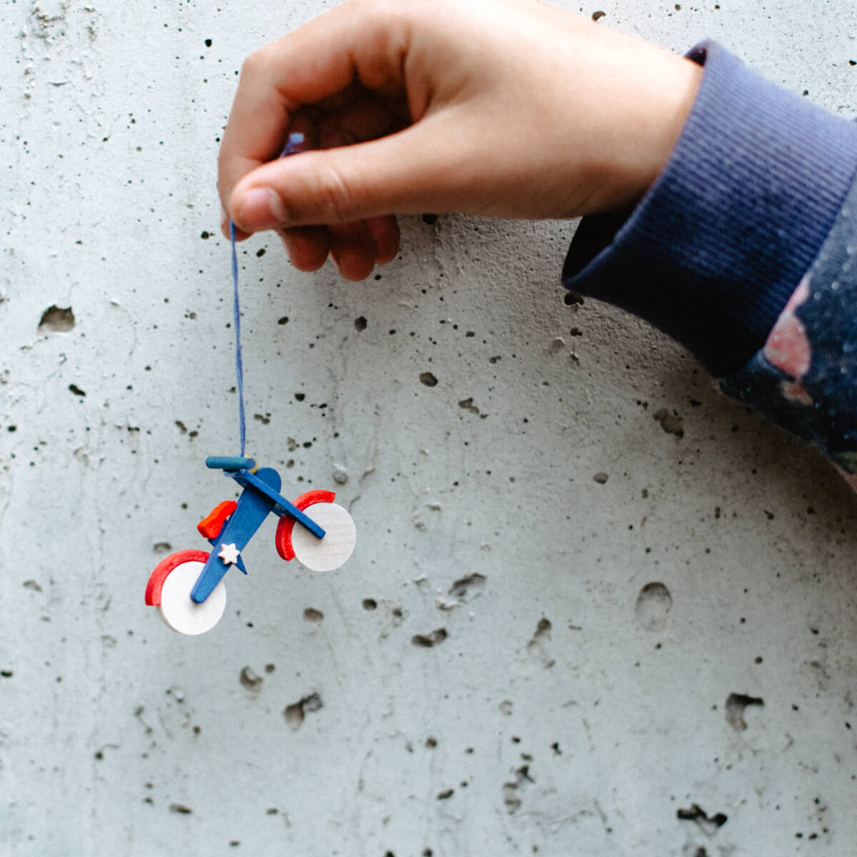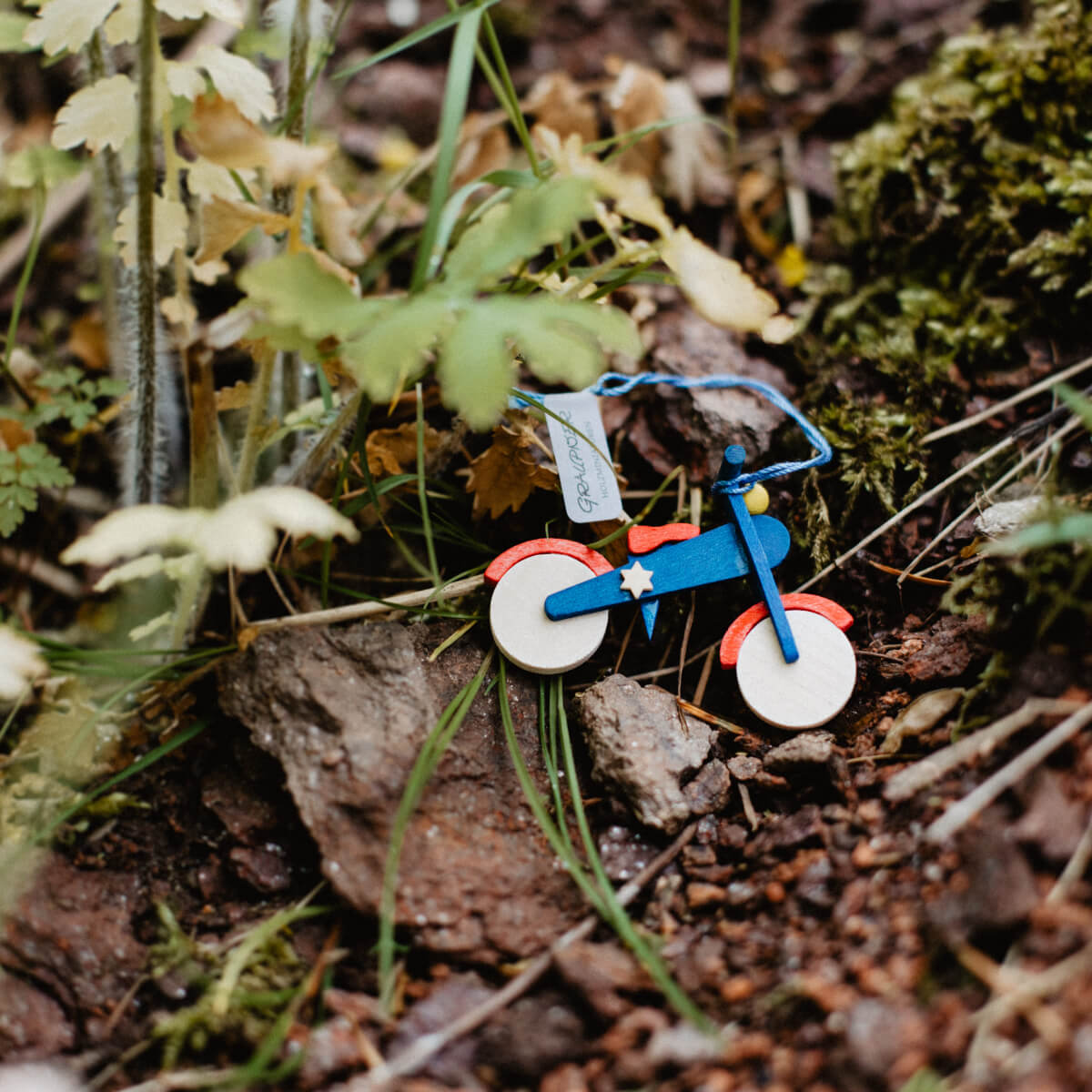 Das kleine Fahrrad macht am Baum vor allem durch die liebevollen Details eine Menge her. Mit dem originellen Design und einer Größe von etwa 6 cm eignet es sich auch hervorragend als Anhänger für einen Weihnachtsstrauß oder als Verzierung für ein größeres Geschenkpaket. Der Anhänger ist mit einem blauen Faden zum Aufhängen versehen.