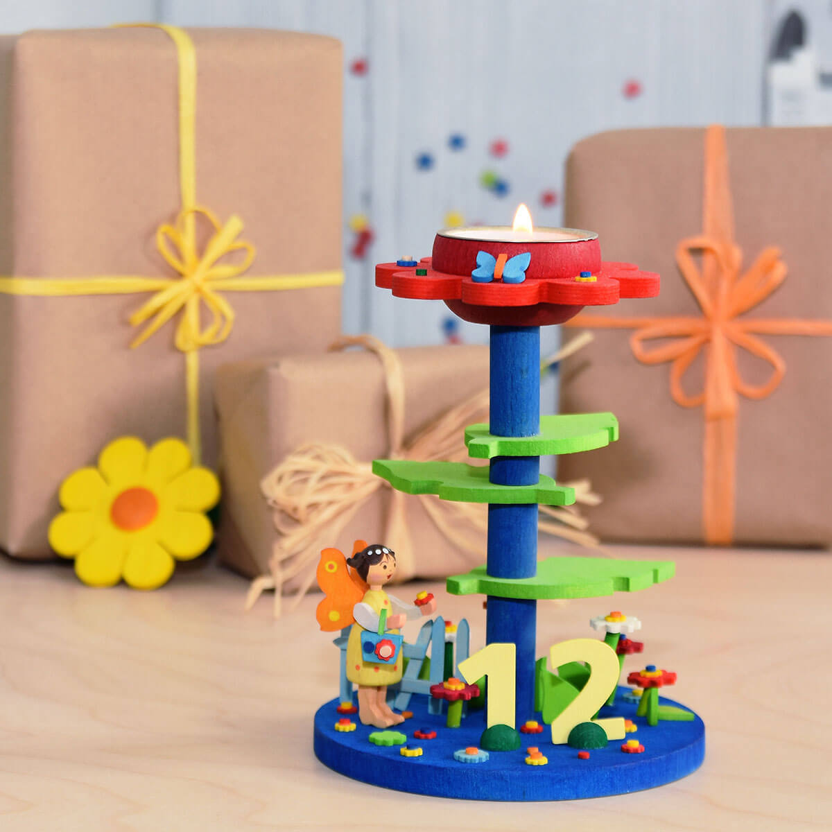 Neben den vielen Blumen und einem lustigen Gartenzaun befindet sich die hochwertige, von Hand bemalte Figur auf dem Leuchter. Insgesamt besteht der Geburtstagsleuchter aus über 100 winzigen Holzteilen.