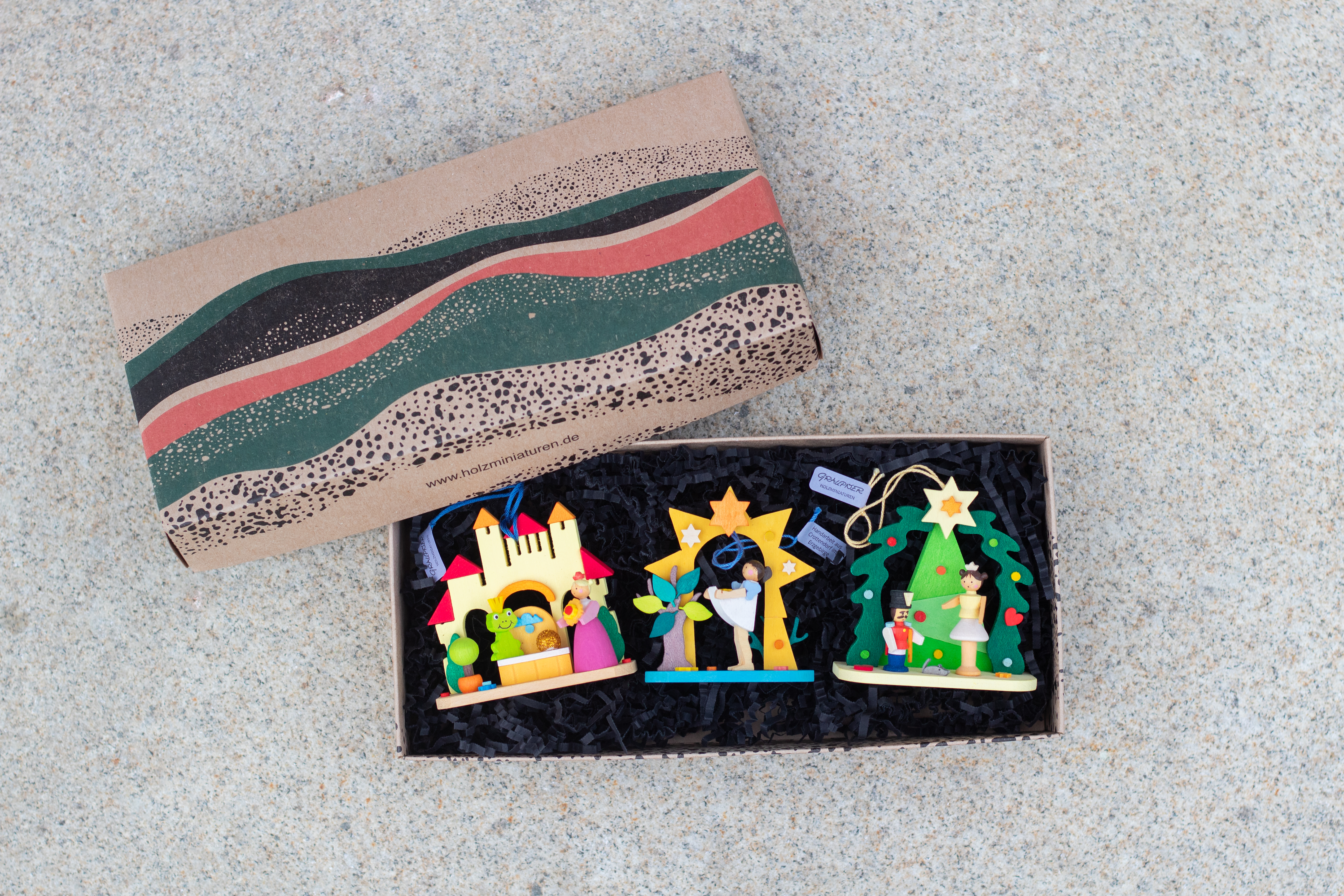 Dazu erhalten Sie eine Grußkarte sowie ein kleines Leporello mit Informationen zu Herstellung und Verarbeitung der Produkte. Die Box wird von uns mit ganz viel Liebe verpackt – nachhaltig und stilvoll zugleich. In der hochwertig bedruckten Geschenkverpackung aus Kraftkarton wird der Baumschmuck eingehüllt in feinstes Seidenpapier auf die Reise zu Ihren Liebsten geschickt. Alles garantiert plastikfrei!