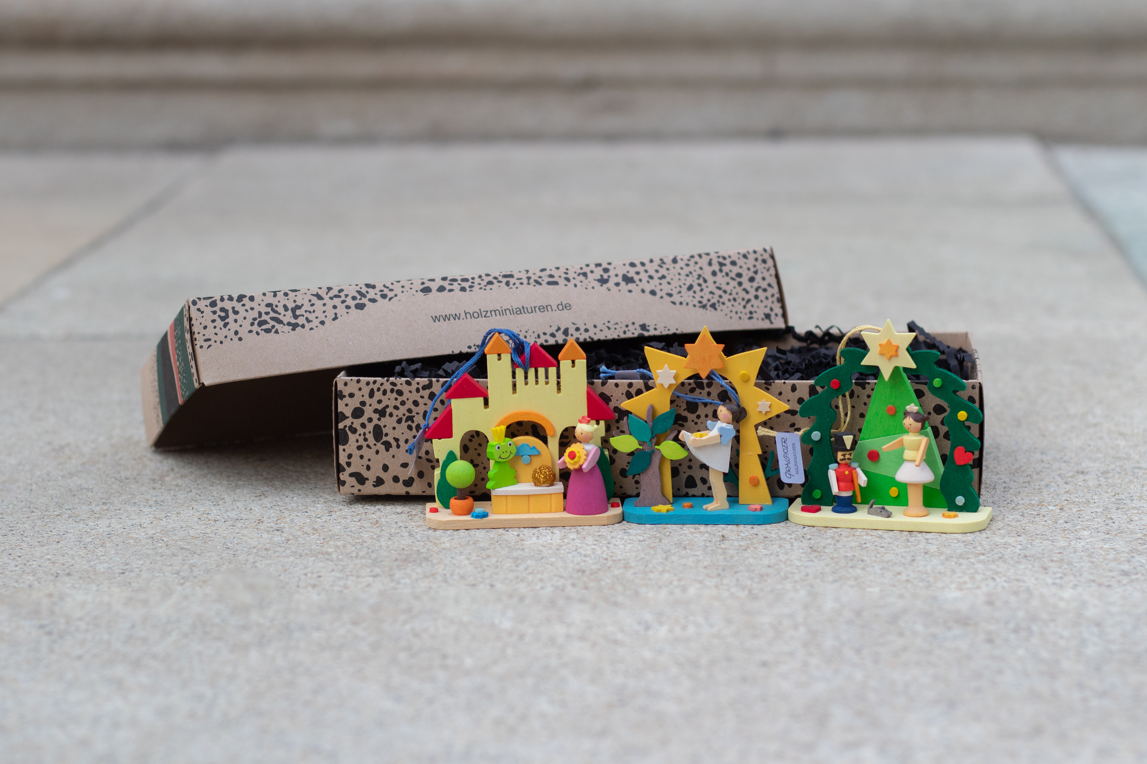 Dieses Geschenkset enthält fünf hochwertige und in aufwendiger Handarbeit gefertigte Baumanhänger: