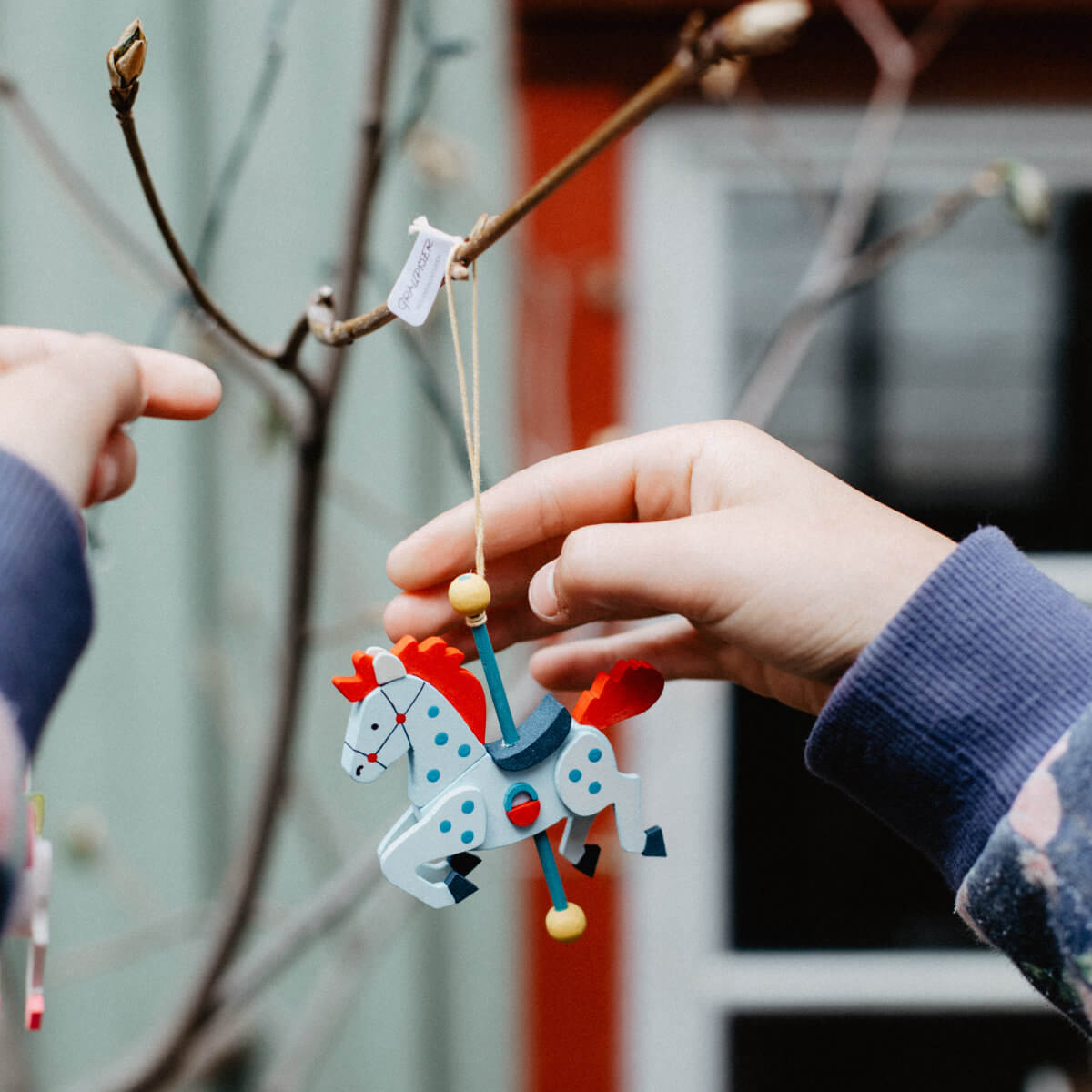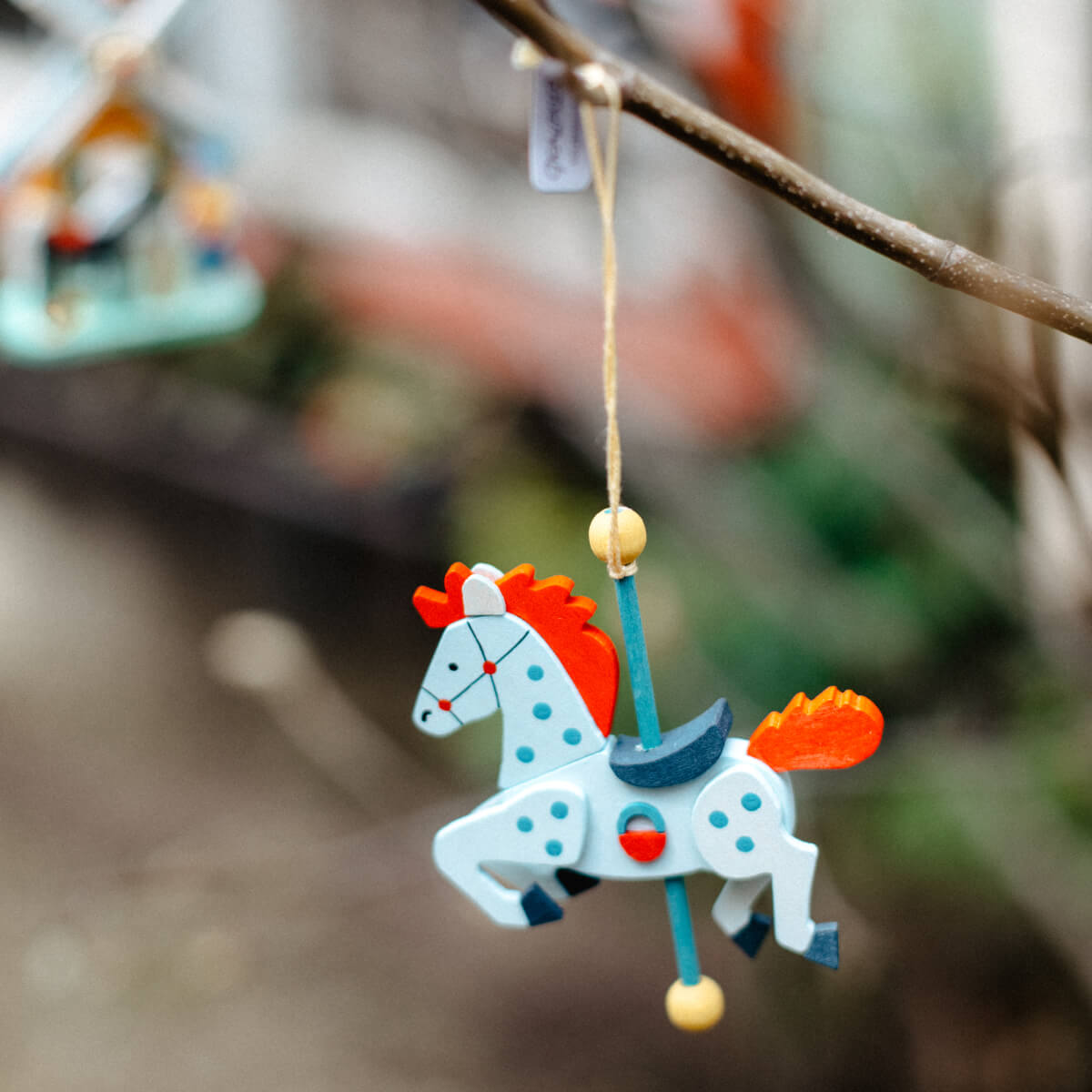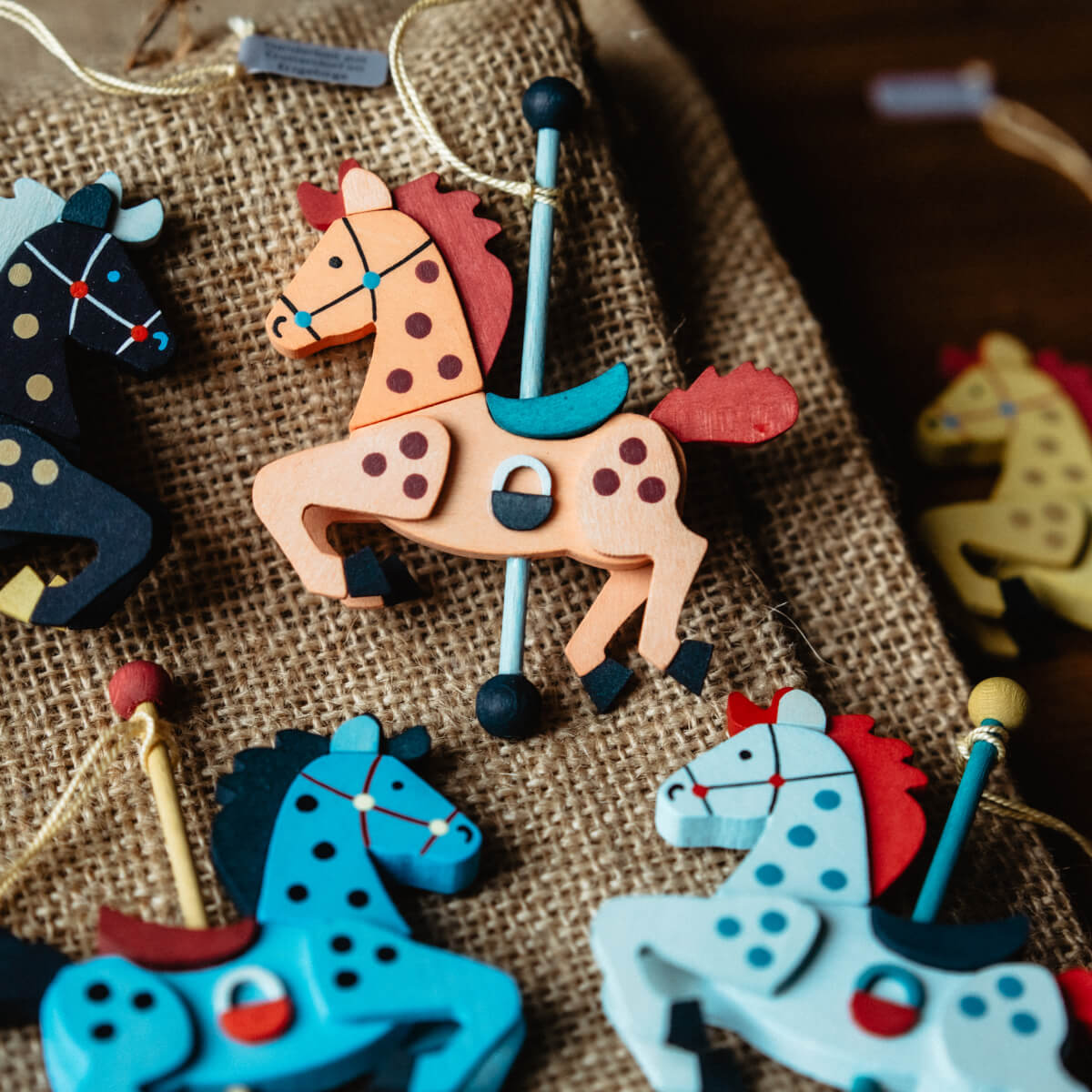 Neben unserer großen Karussellpyramide sind die dazugehörigen Pferdchen auch einzeln als Christbaumschmuck zu erwerben. Die Serie umfasst fünf verschiedene Farbkombinationen in Blautönen, Gelb und Rot. An dem senkrechten Stab ist ein gelber Faden zum Aufhängen angebracht.