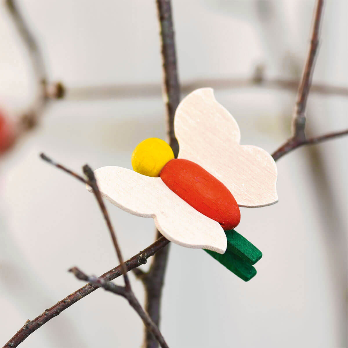 Der Schmetterling besteht aus Bergahorn. Die von uns verwendeten Farben enthalten besonders hochwertige und lichtechte Pigmente, welche dauerhafte Brillanz und Leuchtkraft garantieren. Sie sind nach der strengen DIN EN71 Richtlinie für Spielzeuge zertifiziert, natürlich ungiftig und speichelecht. Makellose Verarbeitung und hohes handwerkliches Geschick vollenden das wertvolle Holz zu einem kleinen Schmuckstück erzgebirgischer Volkskunst.