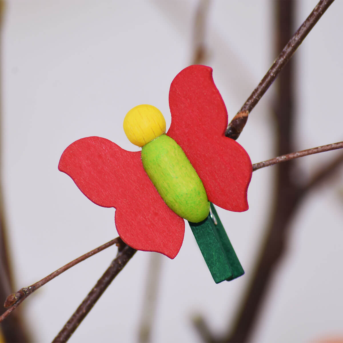 Erzgebirgisches Kunsthandwerk gibt es nicht nur zur Weihnachtszeit. Zum Sortiment unserer Manufaktur zählen darum nicht nur Weihnachtsdekorationen, sondern auch zahlreiche Stücke fürs ganze Jahr. Die farbigen Schmetterlinge mit einer Größe von ca. 27 mm sind ein Blickfang an jedem schönen Frühlingsstrauß. Aber auch als Glücksbringer an einem Geschenk sind die von Hand gefertigten Stücke ein Hingucker. Erhältlich sind die Schmetterlinge, welche rückseitig mit einer Wäscheklammer versehen sind, in zehn verschiedenen Varianten. Wir fertigen die kleinen Stücke sowohl in dunkelblau, hellrot, grün, gelb, orange, lila, weiß, rosa, dunkelrot als auch in hellblau.