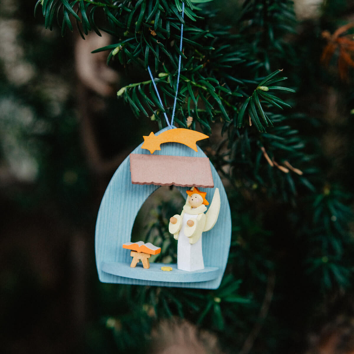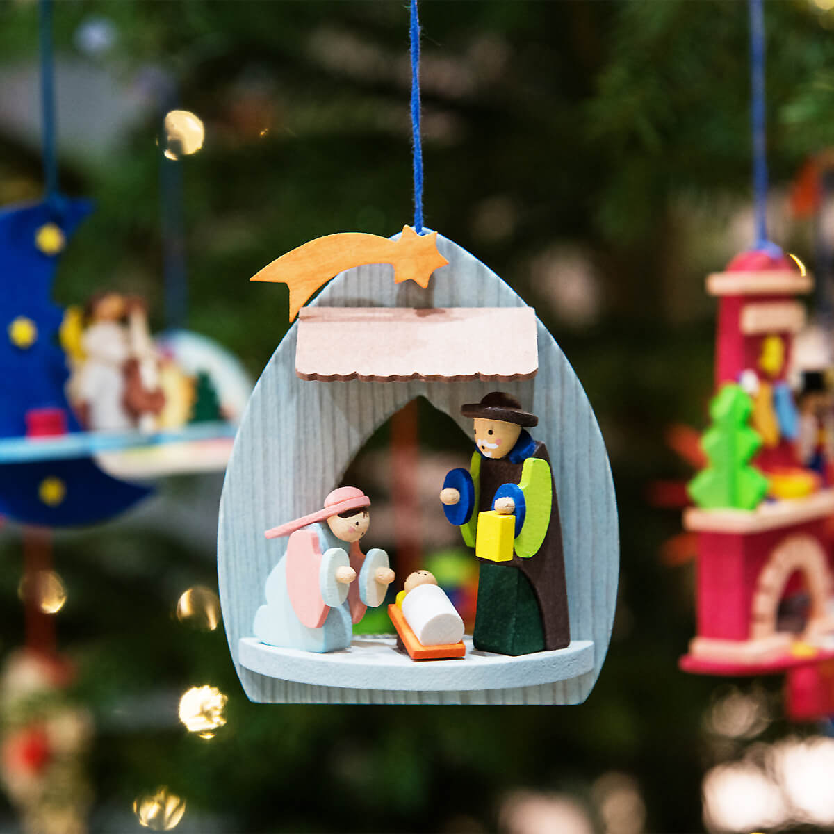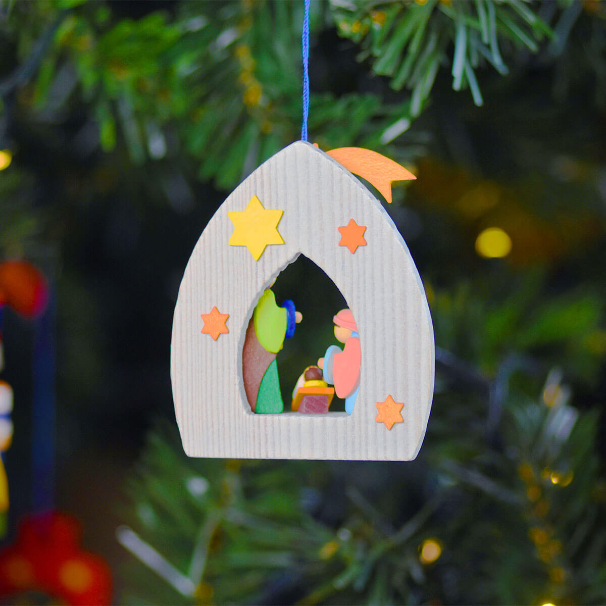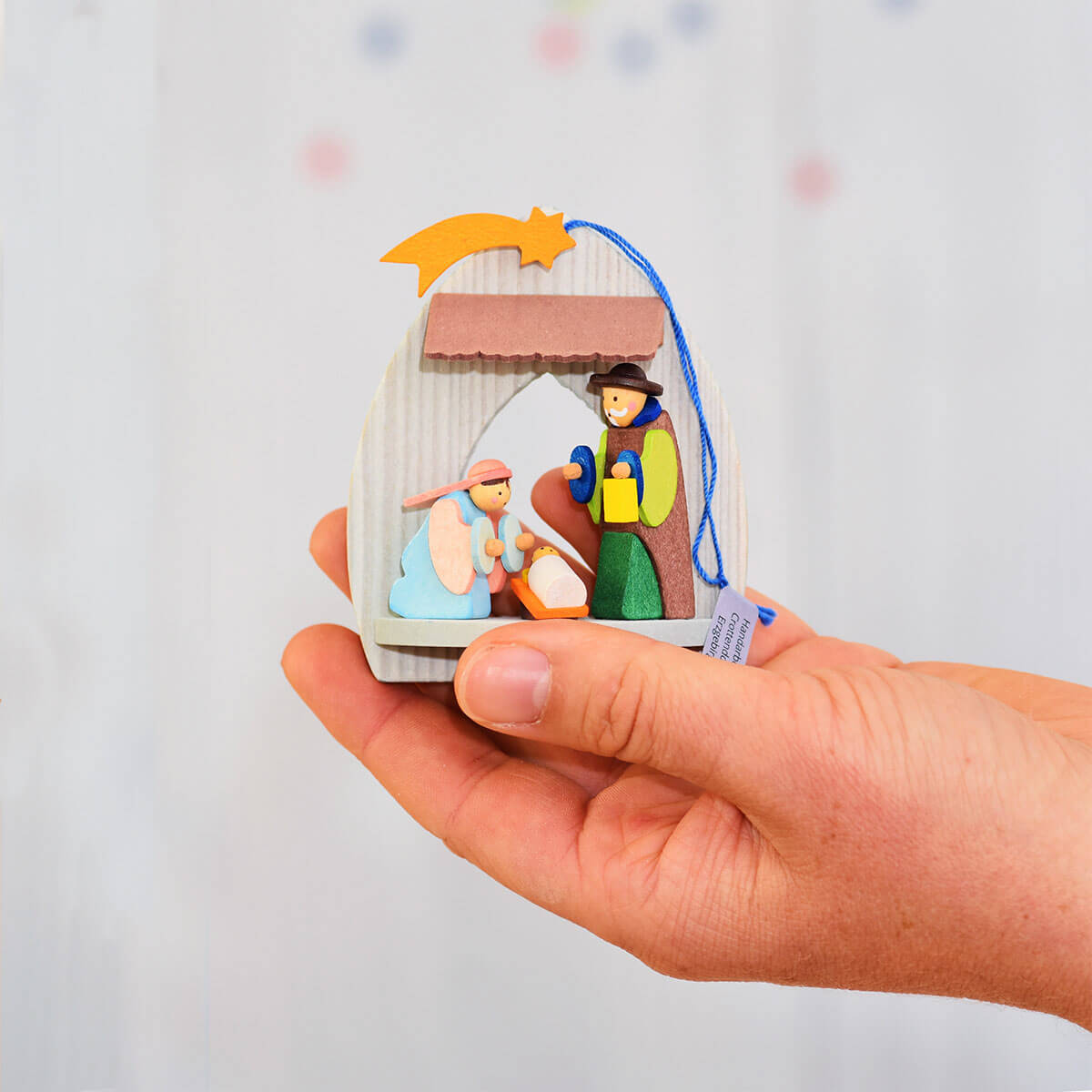 Krippe Christgeburt als Baumschmuck mit heiliger Familie