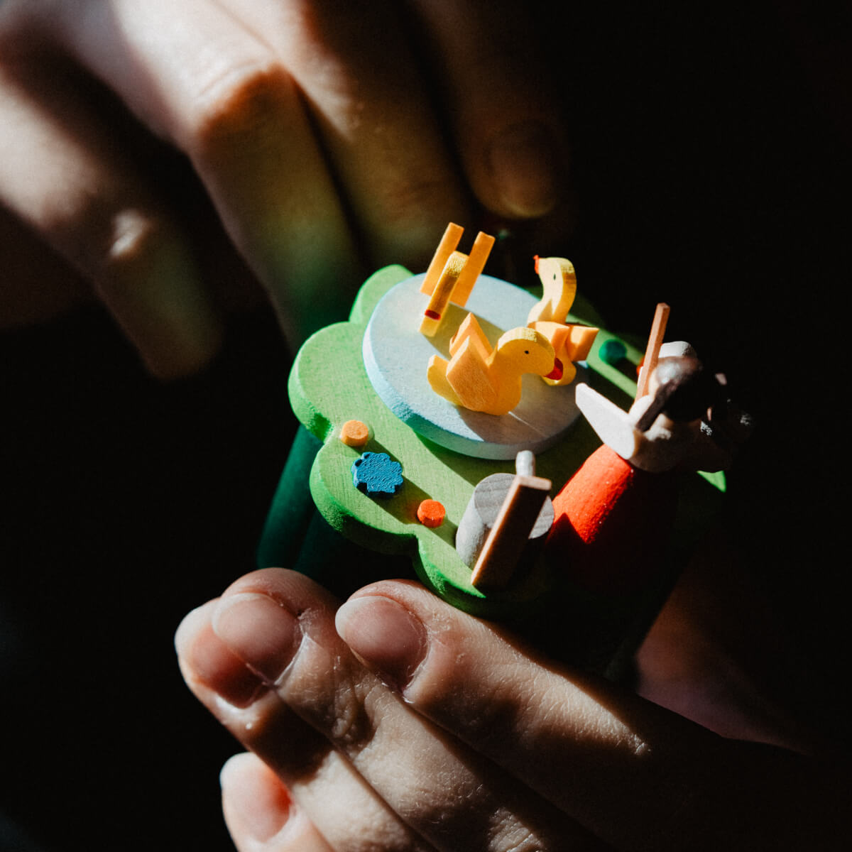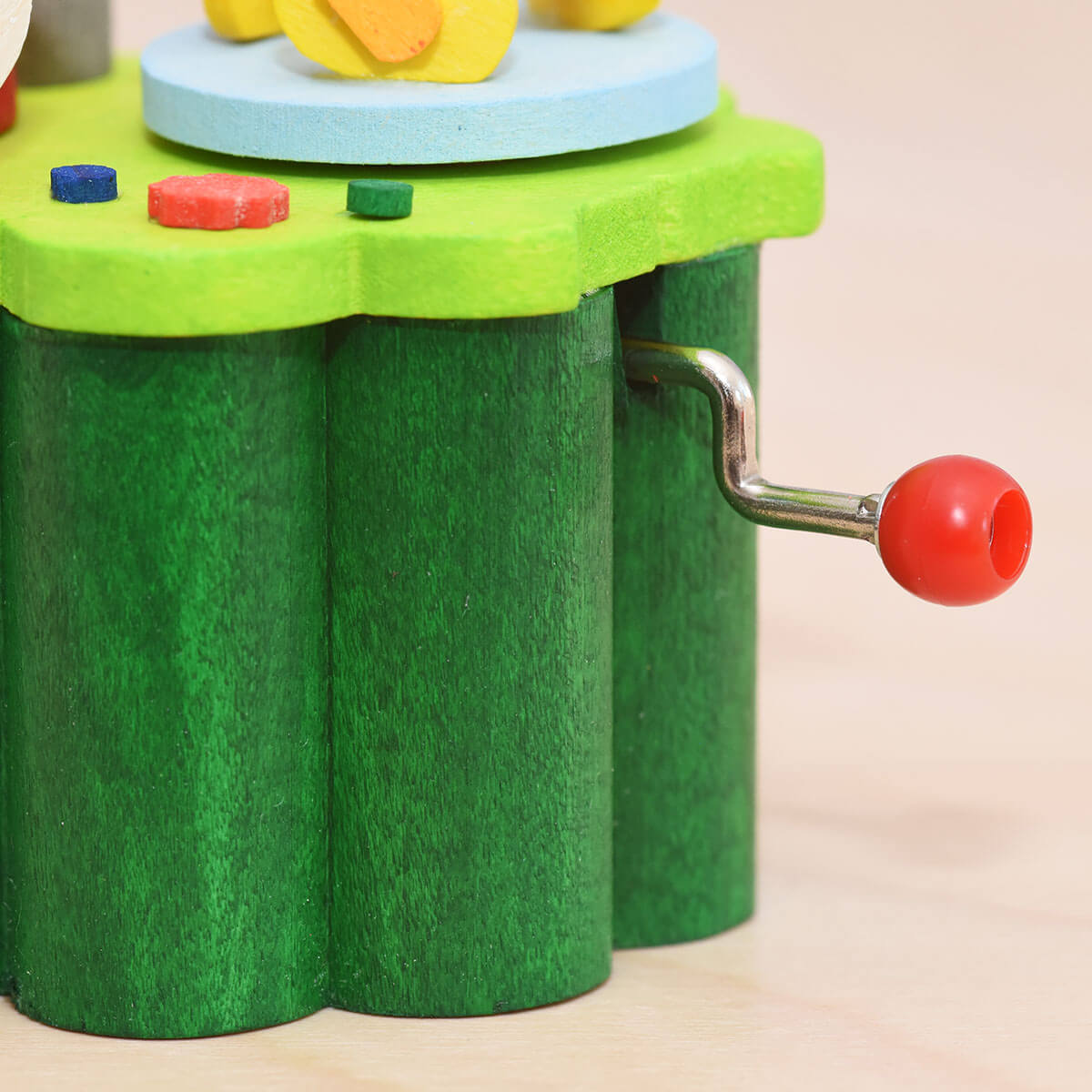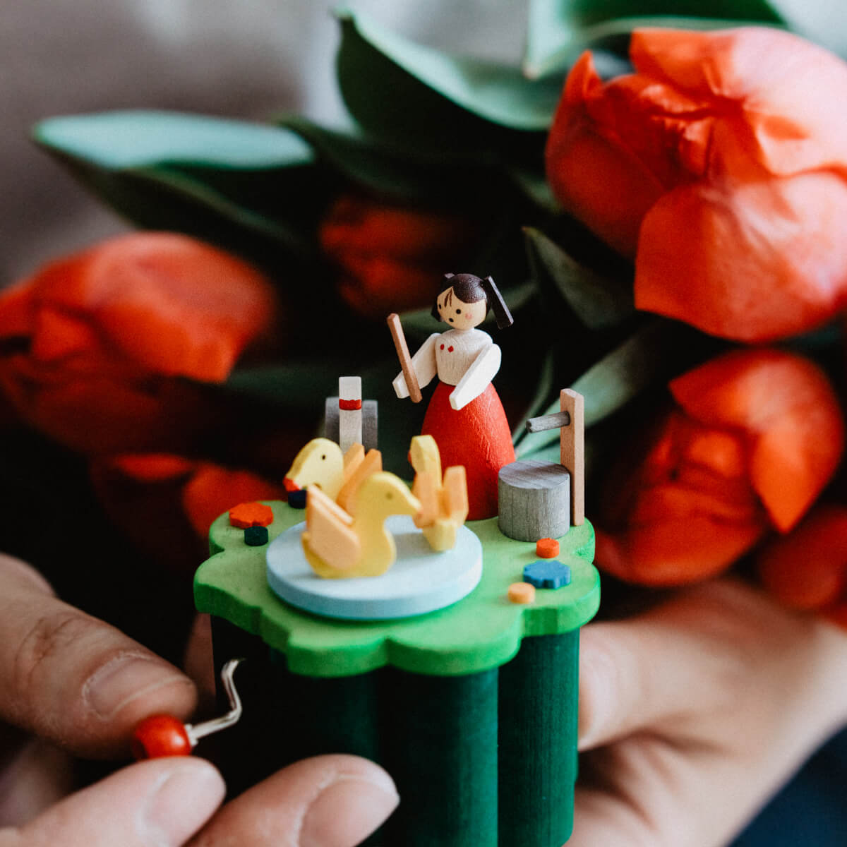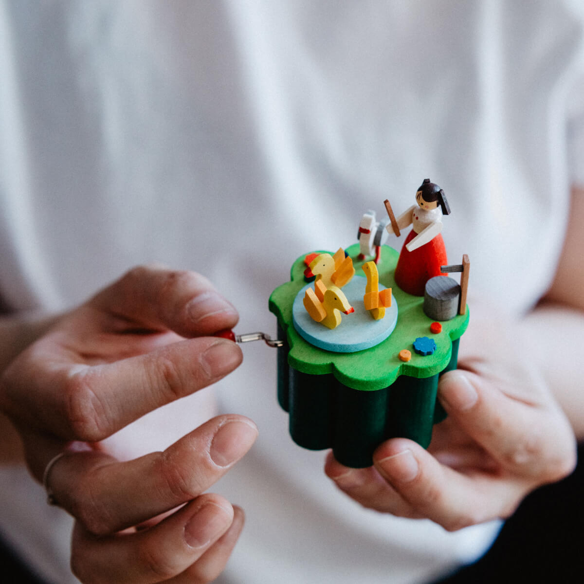 Die hochwertige Handspieldose besteht aus über 30 winzigen Teilen aus Holz. Alle Figuren sind von Hand bemalt. Die Kurbelspieldose ist mit einem mechanischen und langlebigen SANKYO-Spielwerk versehen. Hier muss Hand angelegt werden – die Melodie ertönt beim Drehen der Kurbel.