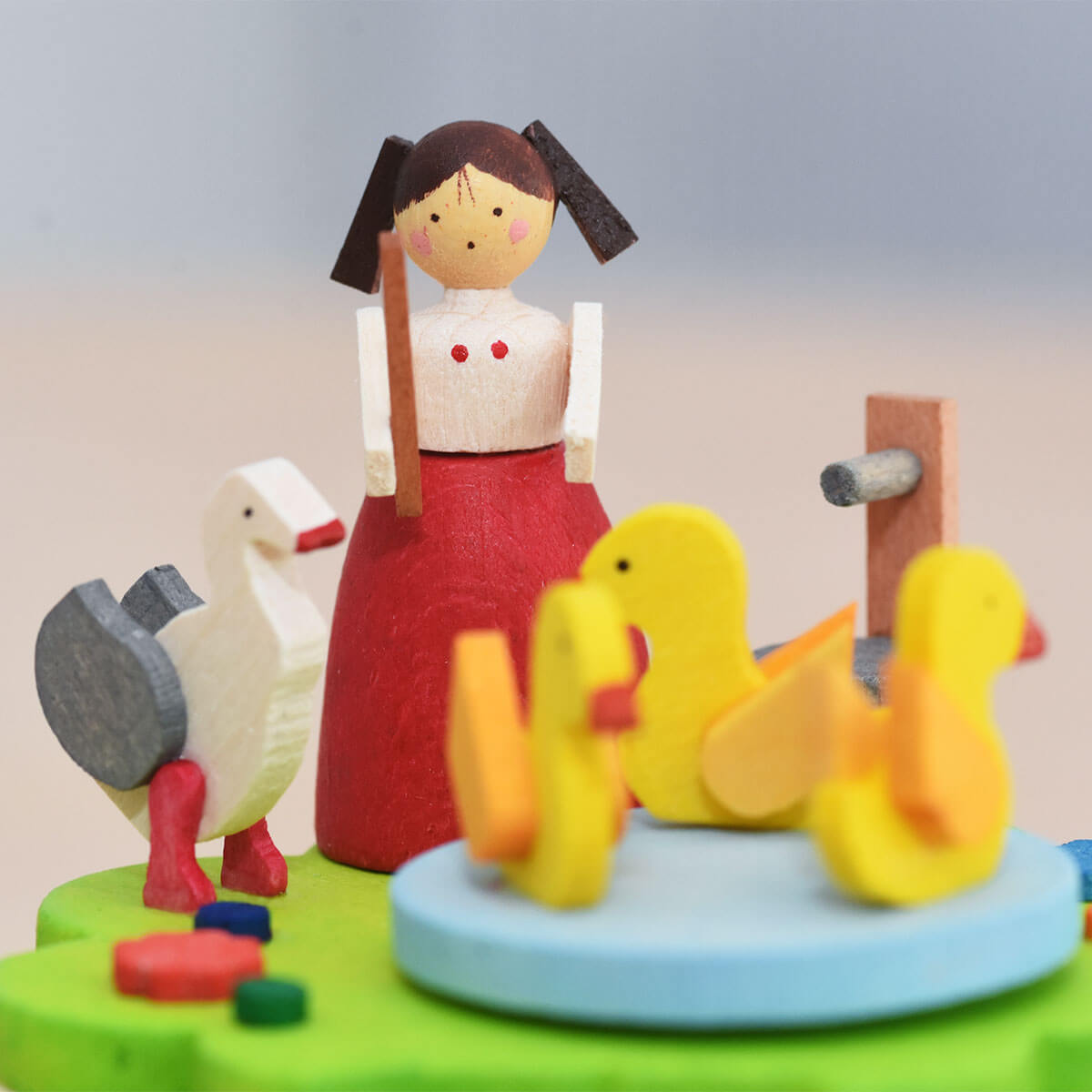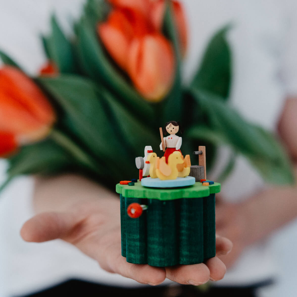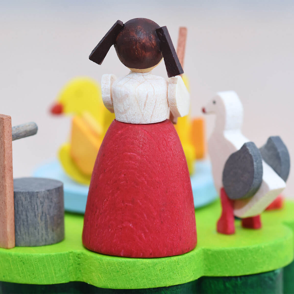 Zur Melodie von „Alle Vögel sind schon da“ hütet das nur 3 cm große Gänseliesel ihre drei Gänse, die sich dabei fröhlich im Kreis drehen. Am Brunnen darf auch ein kleines Entchen nicht fehlen. Die Basis der Musikbox bildet ein leuchtend grüner Blumensockel.