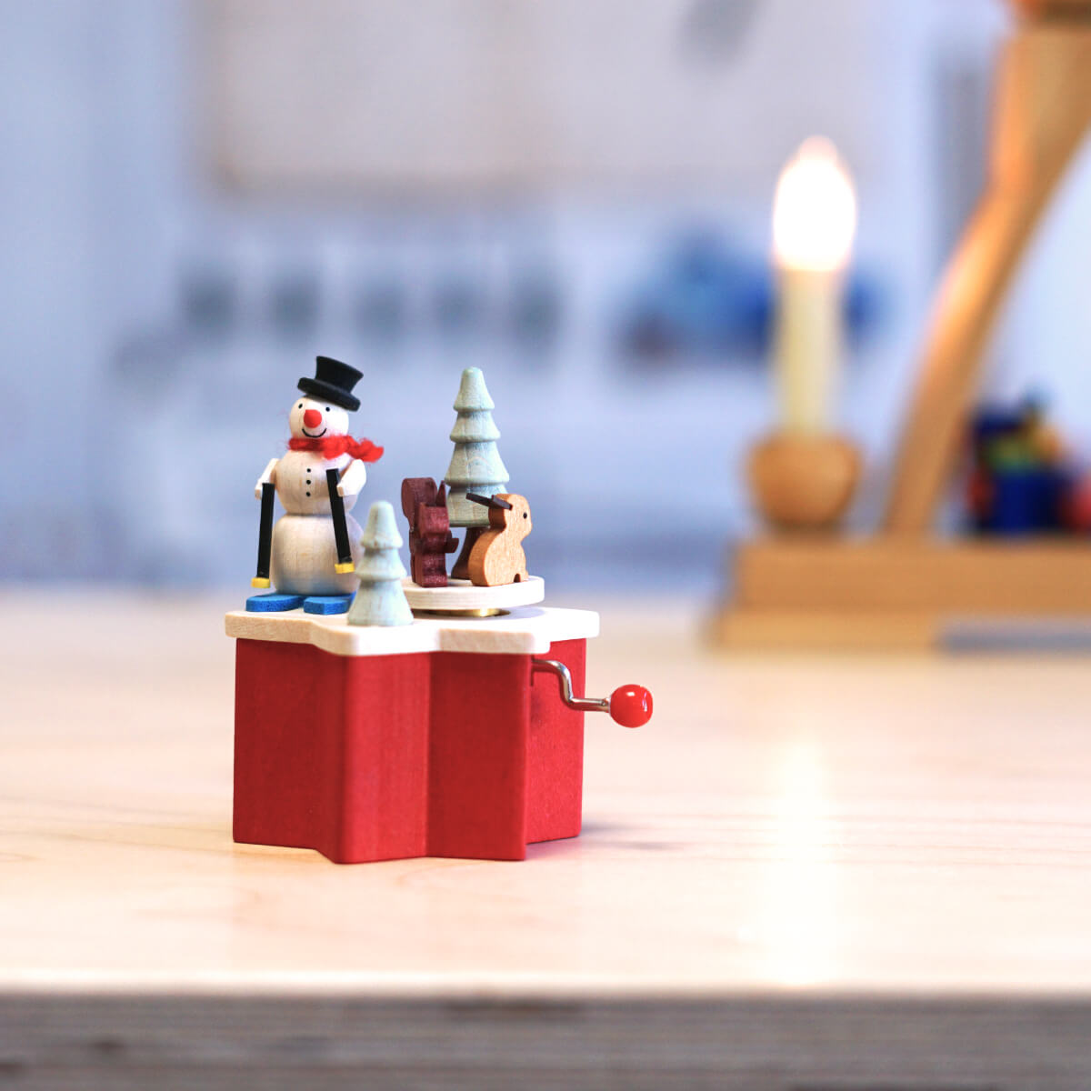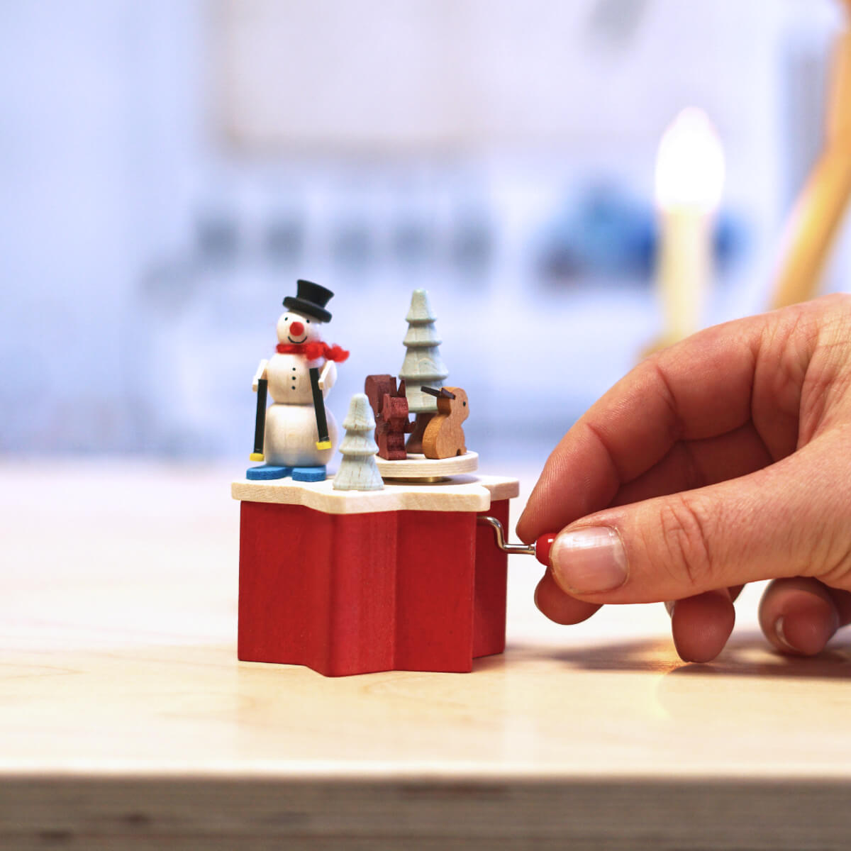 Unser Schneemann mit der winterlichen Szene hat sich mit seinen Skiern auf den Weg in den Wald gemacht. Eichhörnchen und Hase drehen sich zur Melodie von „Schneeflöckchen, Weißröckchen“ im Kreis. Die Basis der Musikbox bildet der leuchtend rote Stern