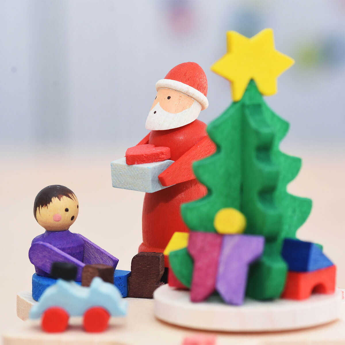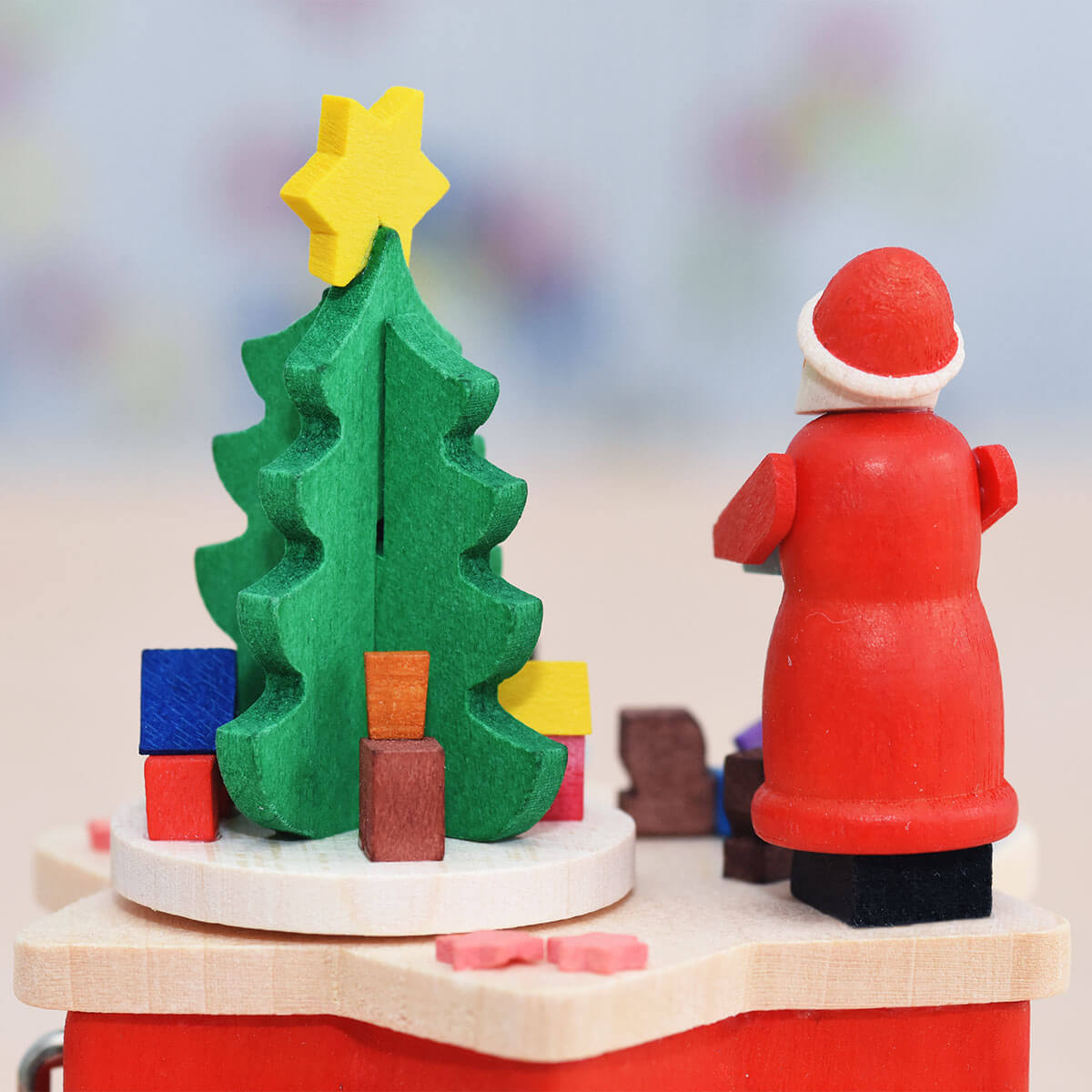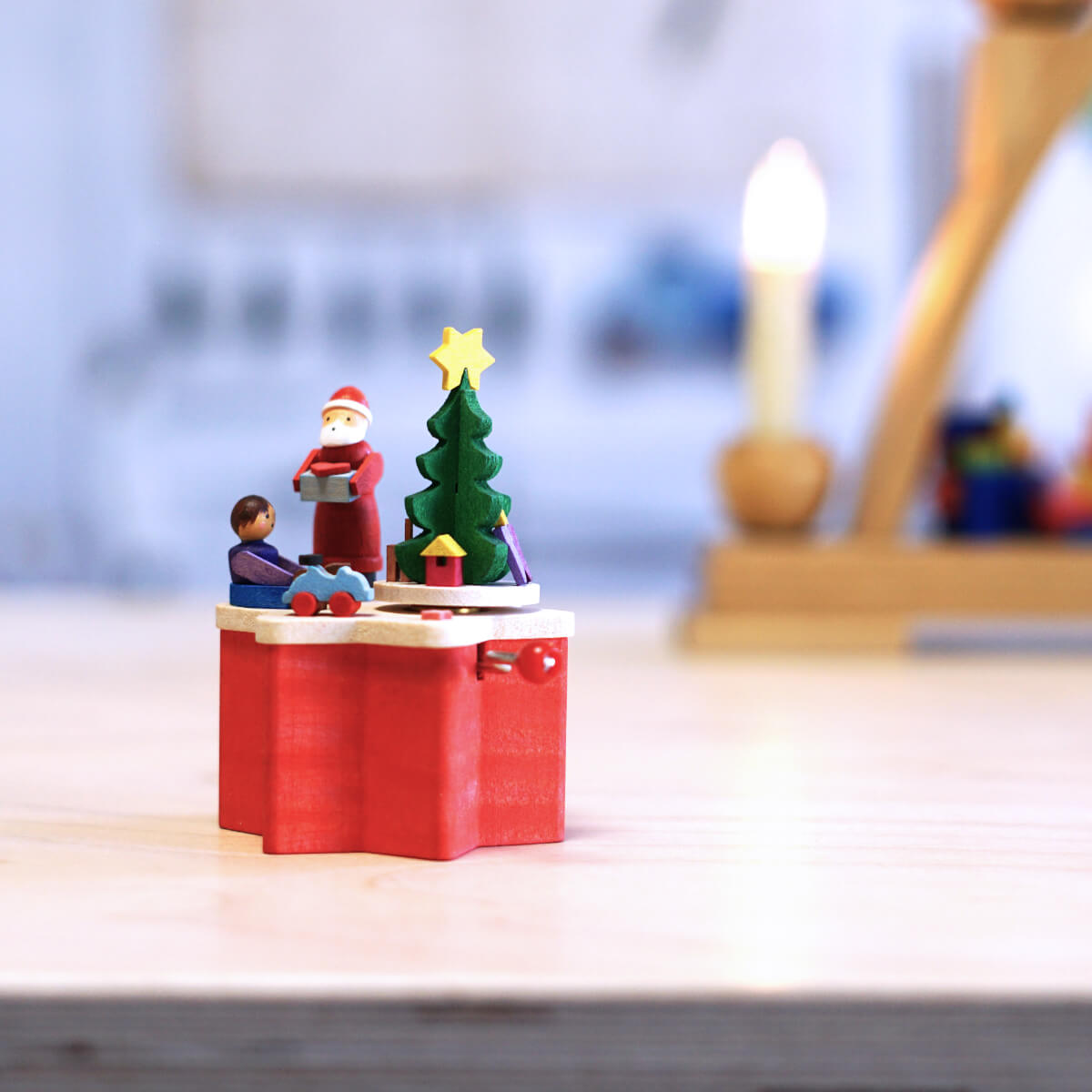 Das klassische Weihnachtsmannmotiv lebt von seiner Farbigkeit und bietet auf so kleinem Raum doch so viel zu entdecken. Die Basis der Musikbox bildet der leuchtend rote Stern. Der Tannenbaum mit den vielen Spielzeugen dreht sich zur Melodie von „Oh Tannenbaum“ im Kreis und stimmt auf den Heiligen Abend ein. Was wohl in dem Geschenk vom Weihnachtsmann sein mag?