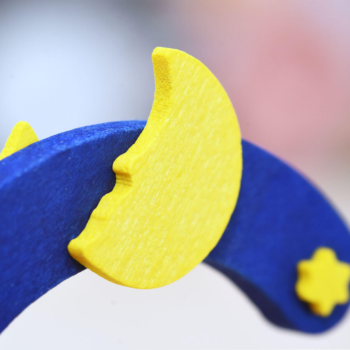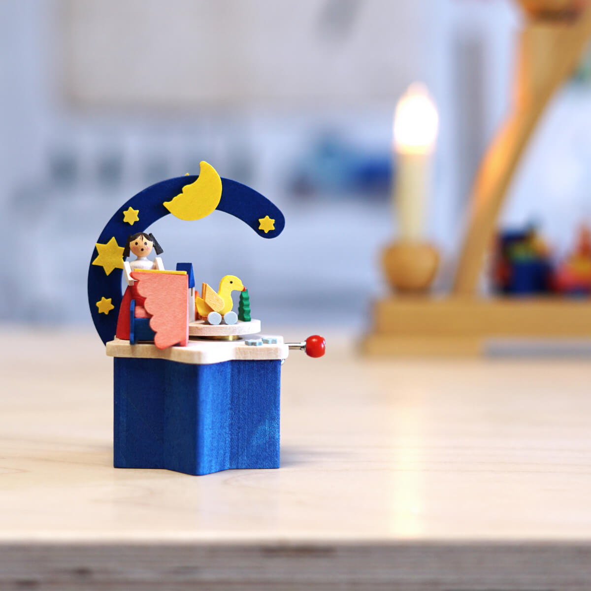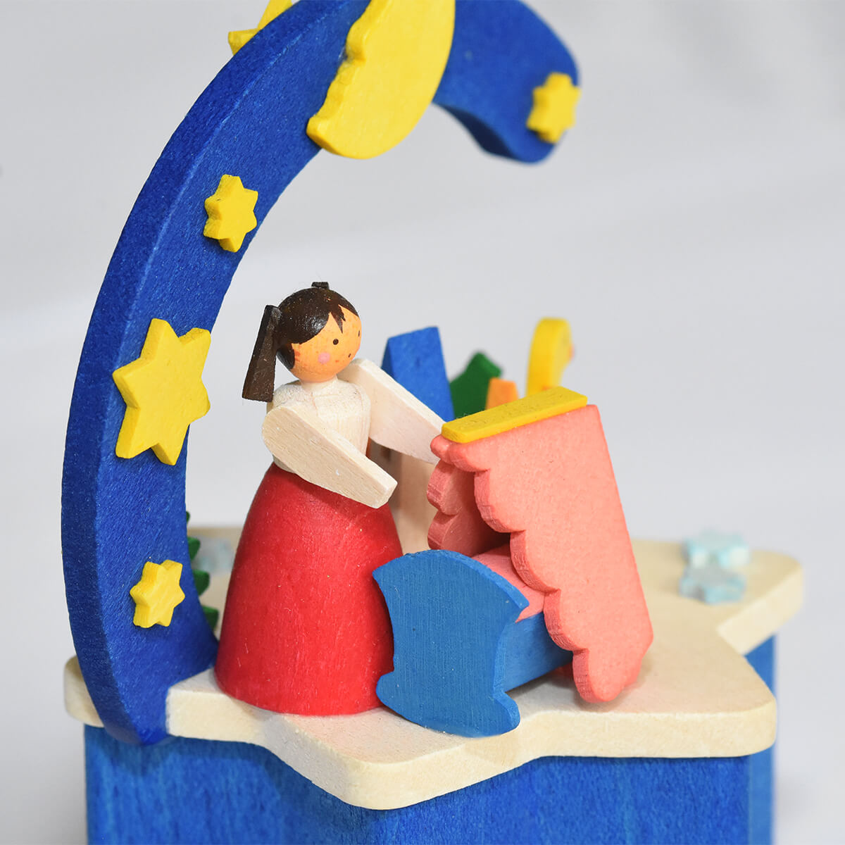 Zur Melodie von „Brahms Wiegenlied“ schaukelt die Puppenmutti ihr Kleines in der Wiege. Dabei drehen sich die bunten Spielzeuge fröhlich im Kreis. Die Basis der Musikbox bildet der leuchtend blaue Stern. Der Bogen ist mit winzigen Sternen und einem Mond verziert.