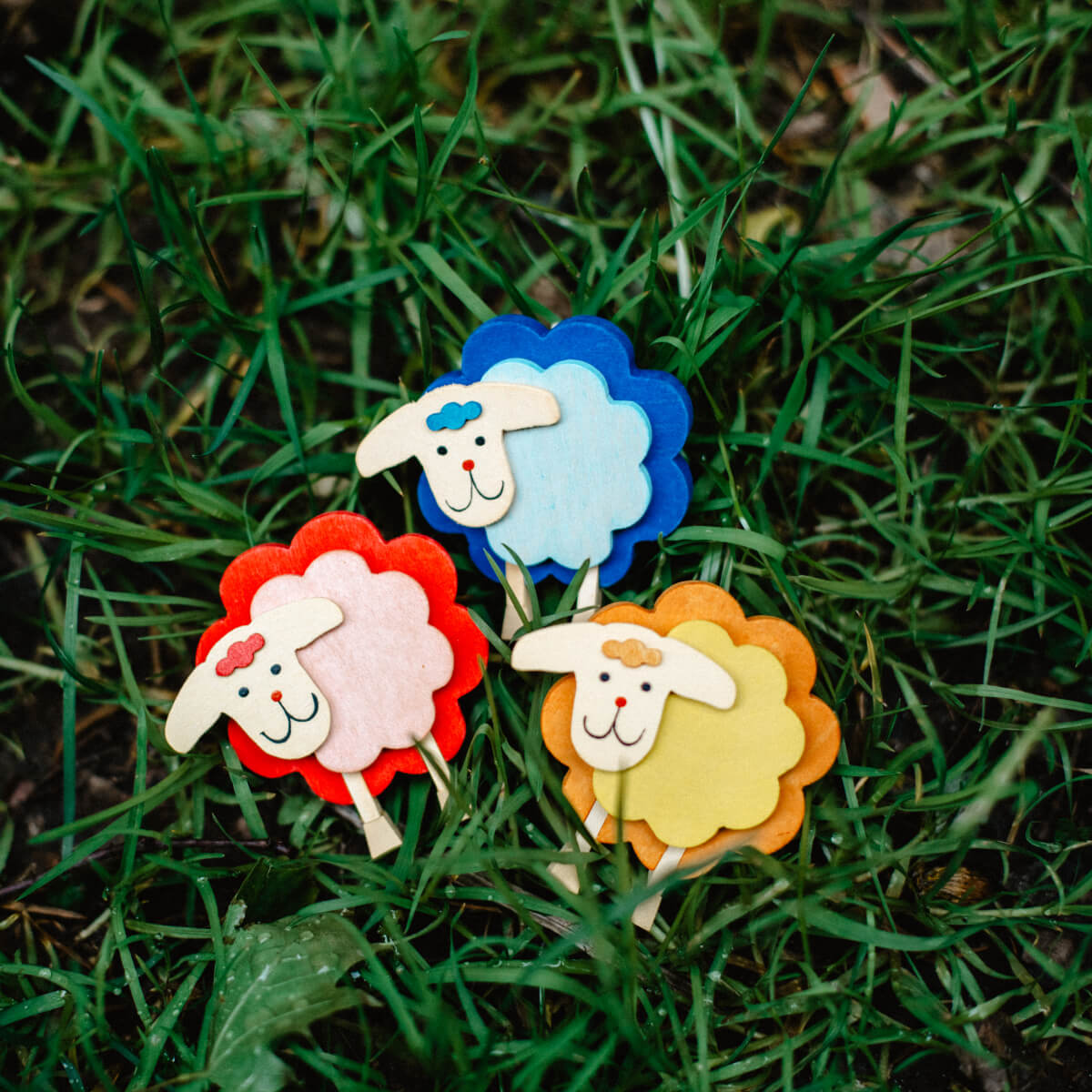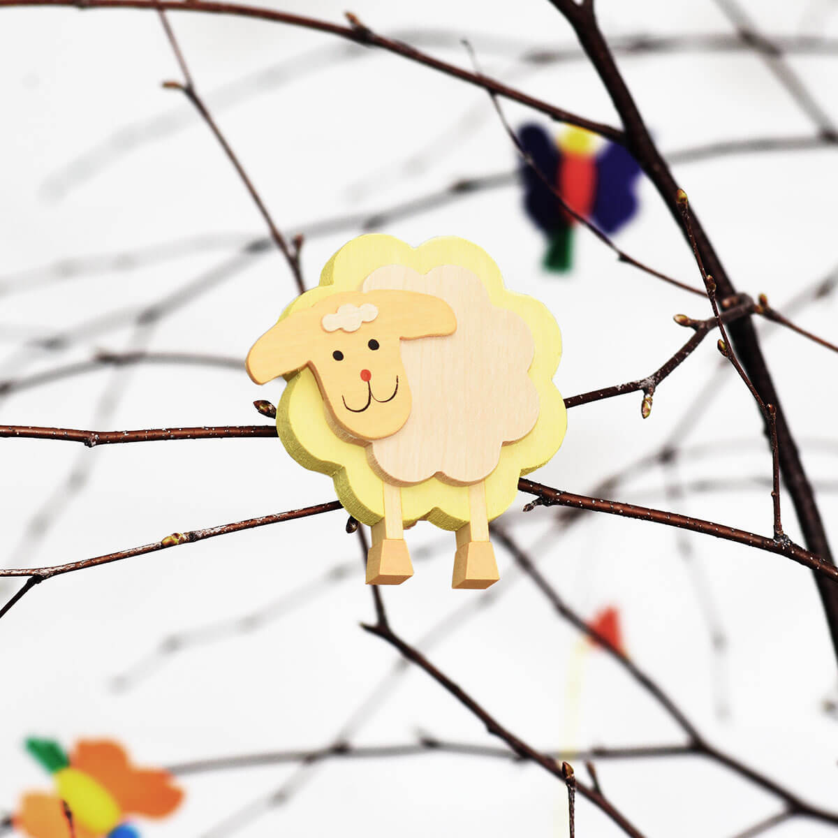 Farbiges Schaf aus Holz mit rückseitig angebrachter Klammer zum anklipsen.