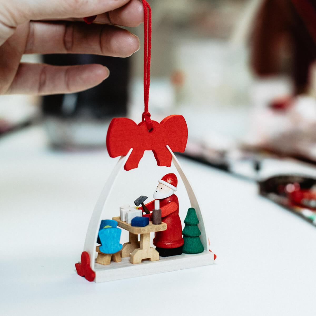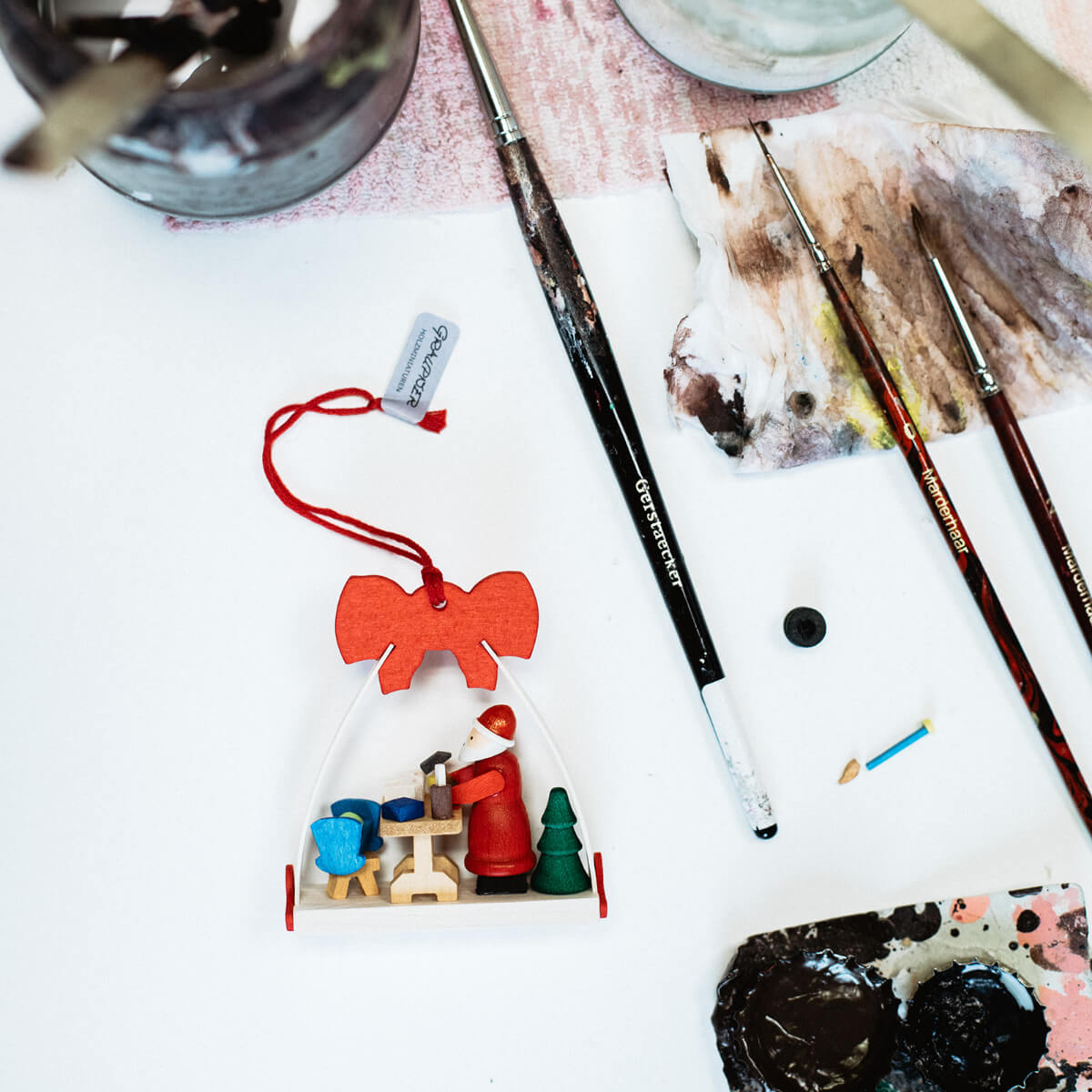 Unser Klassiker – der von Hand bemalte Weihnachtsmann als Miniaturfigur im roten Mantel, eingerahmt von seiner roten Schleife. Schon seit Jahren einer unserer Bestseller und passend als Christbaumschmuck für jeden Weihnachtsbaum oder Weihnachtsstrauß. Die Schleife ist mit einem roten Faden zum Aufhängen versehen. Aber auch auf dem Festtagstisch macht sie sich als kleines Schmuckstück hervorragend.