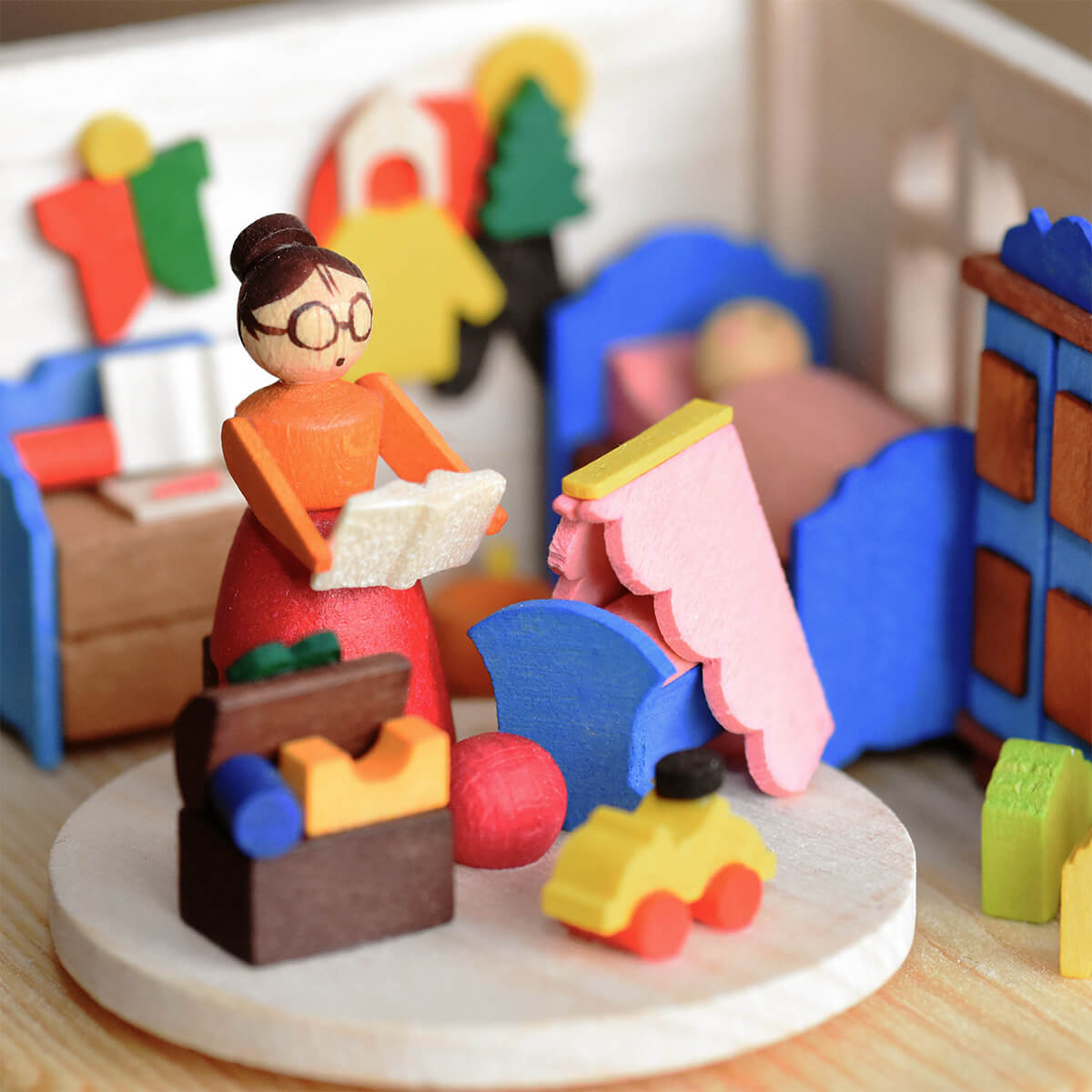 Eine gemütliche Szene im Kinderzimmer mit unzähligen Details. Zur Melodie des beliebten Klassikers „La Le Lu“ liest die Großmutter mit ihrer großen Lesebrille noch die letzte Gutenachtgeschichte.