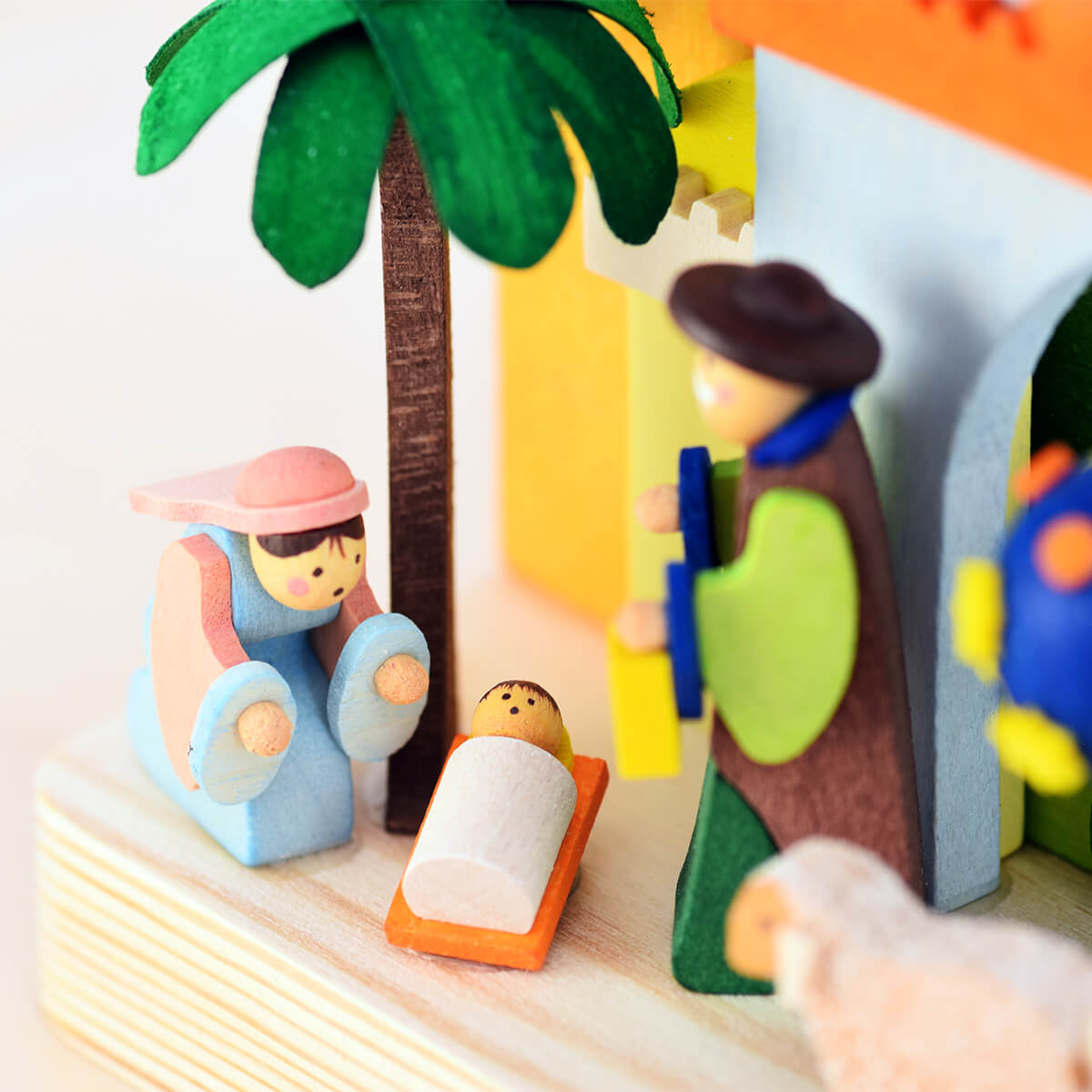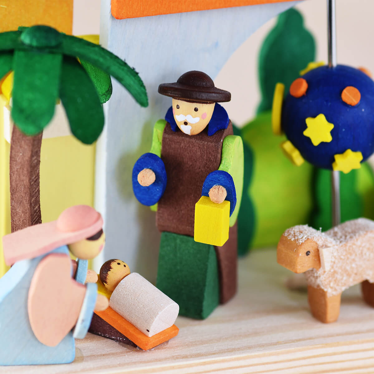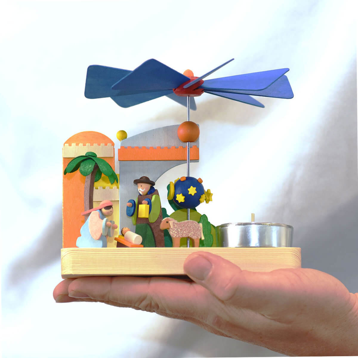 Christi Geburt ist wohl das beliebteste Motiv auf erzgebirgischen Weihnachtspyramiden. Wir haben die Heilige Familie in unserem eigenen Design umgesetzt und die Szene um eine farbige Stadtkulisse erweitert. Alle Figuren und Tiere sind von Hand bemalt. Die kleine Teelichtpyramide mit ihren unzähligen Details ist ein beliebtes Geschenk – sei es für einen lieben Freund, die (Enkel-) Kinder oder als originelles Mitbringsel in der Weihnachtszeit. Natürlich kann man sich damit auch ganz hervorragend selbst eine Freude bereiten und eine tolle Weihnachtsdeko zaubern.