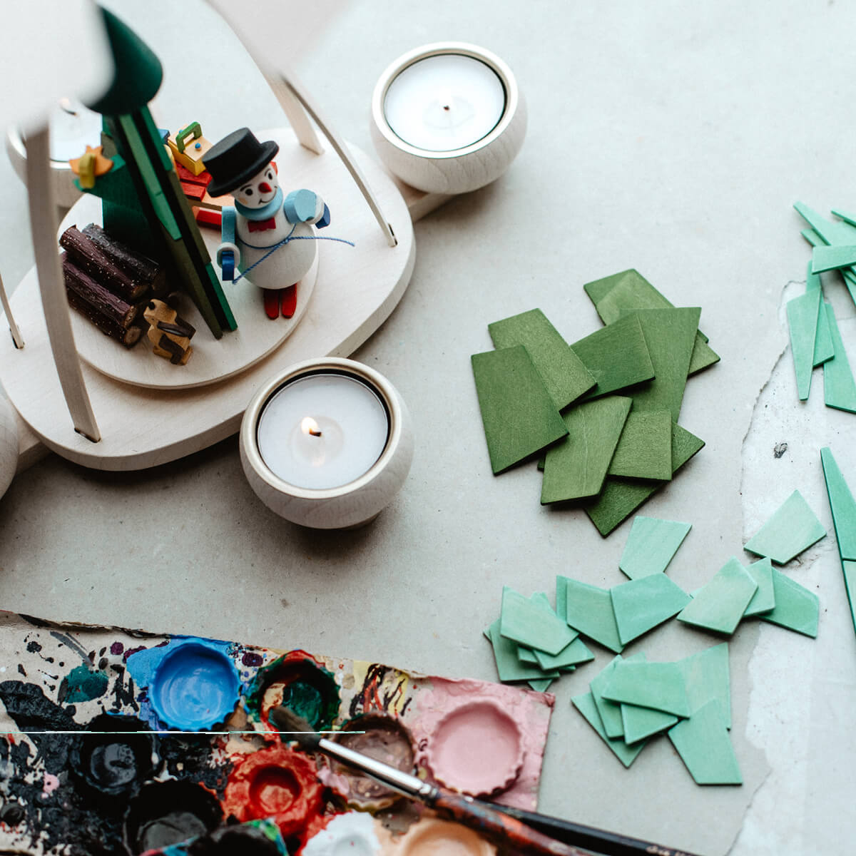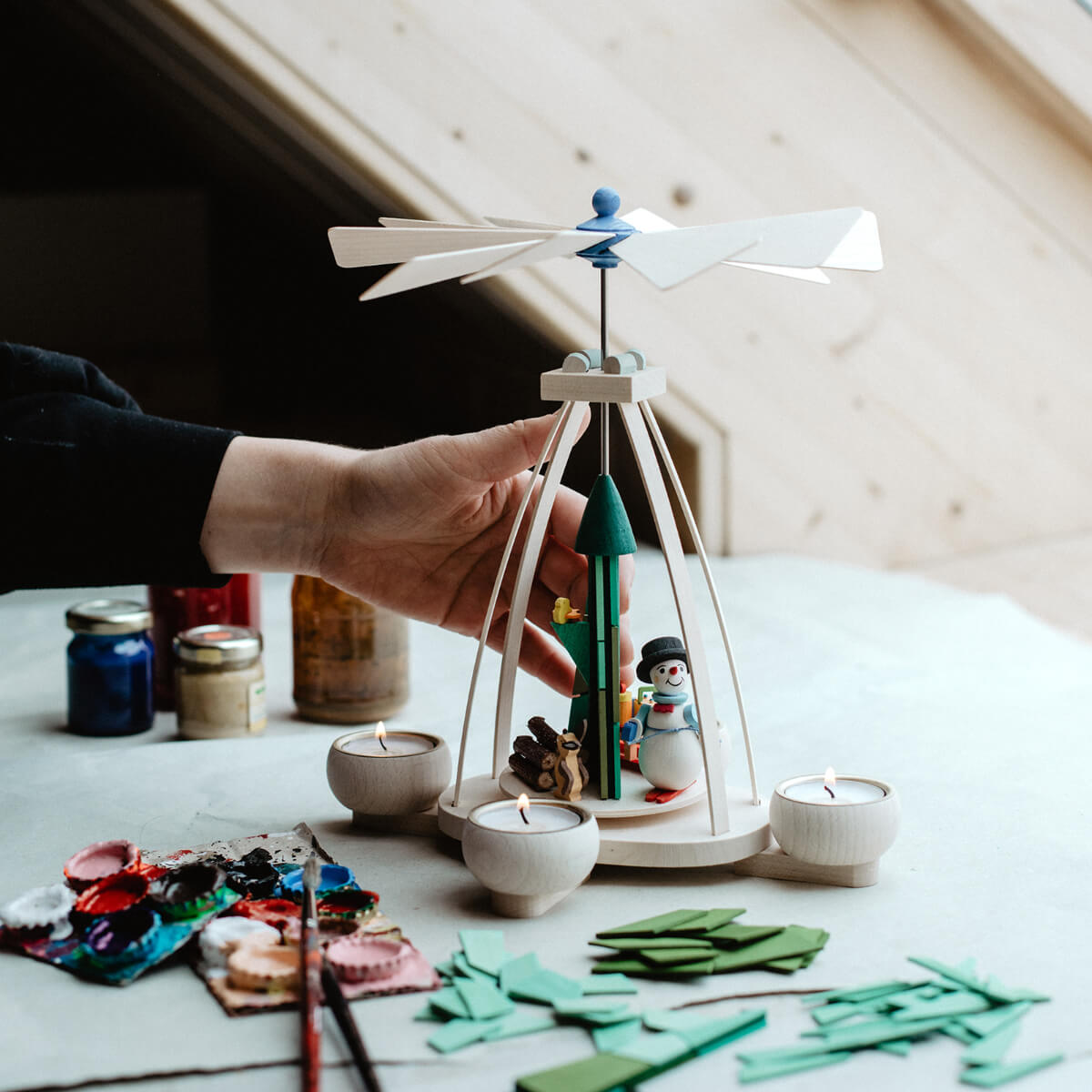Vom Holzzuschnitt bis hin zur Verpackung erledigen wir alle Arbeitsschritte des Fertigungsprozesses in unserer Manufaktur für Original Erzgebirgische Holzkunst®. Besonderes Fingerspitzengefühl erfordert das Zusammensetzen aller winzigen Details dieser Tischpyramide zu einer stimmigen Winterszene. Selbst der miniaturgroße Schneemann und auch das Häschen sind von Hand bemalt; der Schal des Schneemanns von Hand geknotet und auch der Holzstapel ganz authentisch aus kleinen Birkenästchen gesägt. Wir fertigen alle unsere Produkte aus PEFC-zertifiziertem Bergahorn und verwenden Farben auf Wasserbasis nach DIN EN 71. Die von uns verwendete farbige Beize gibt dem Werkstoff Holz einen ganz einzigartigen Charme mit matter Oberfläche.