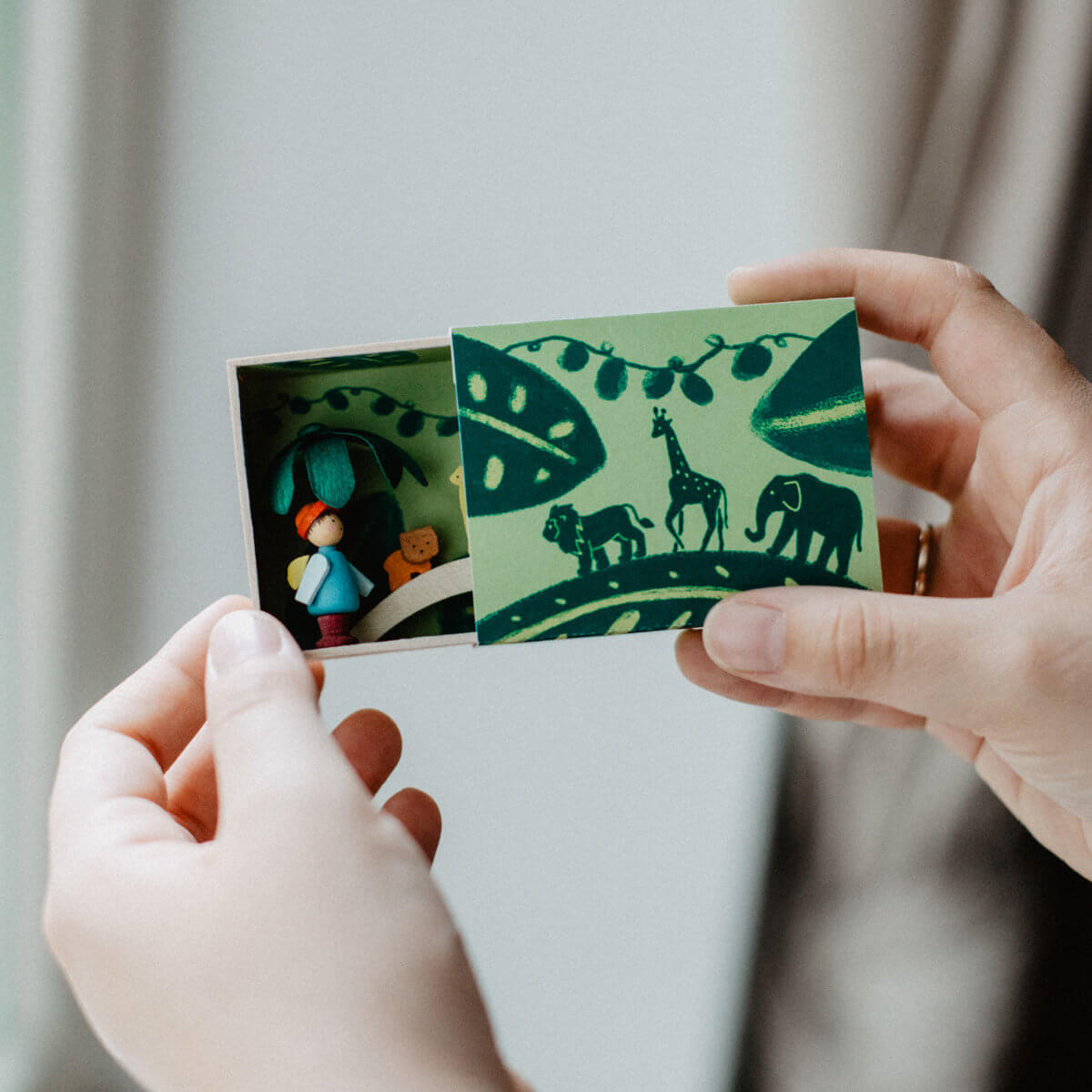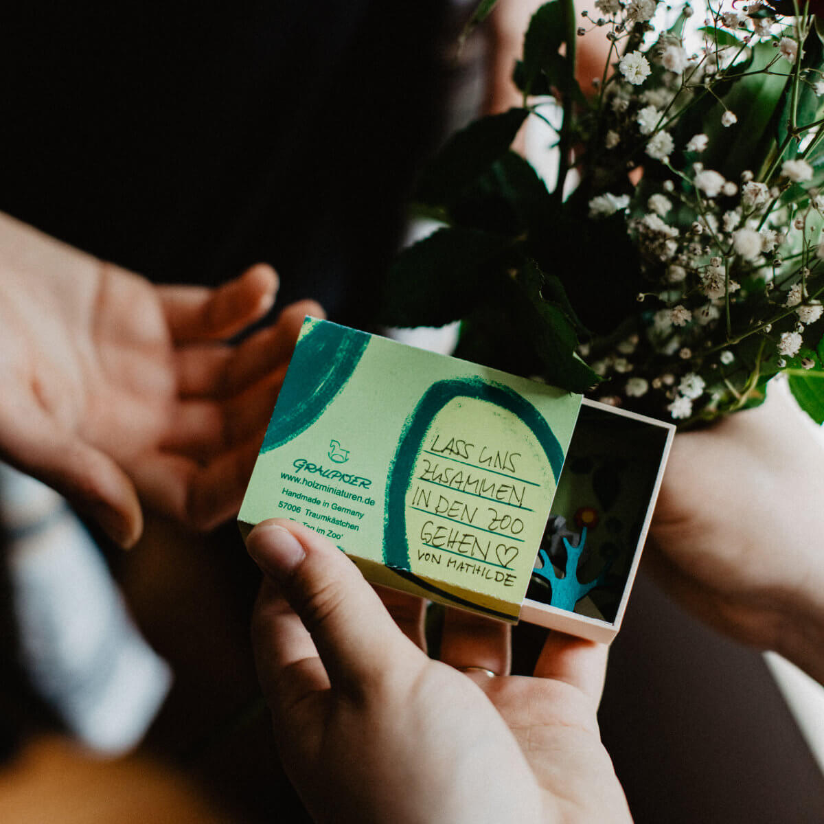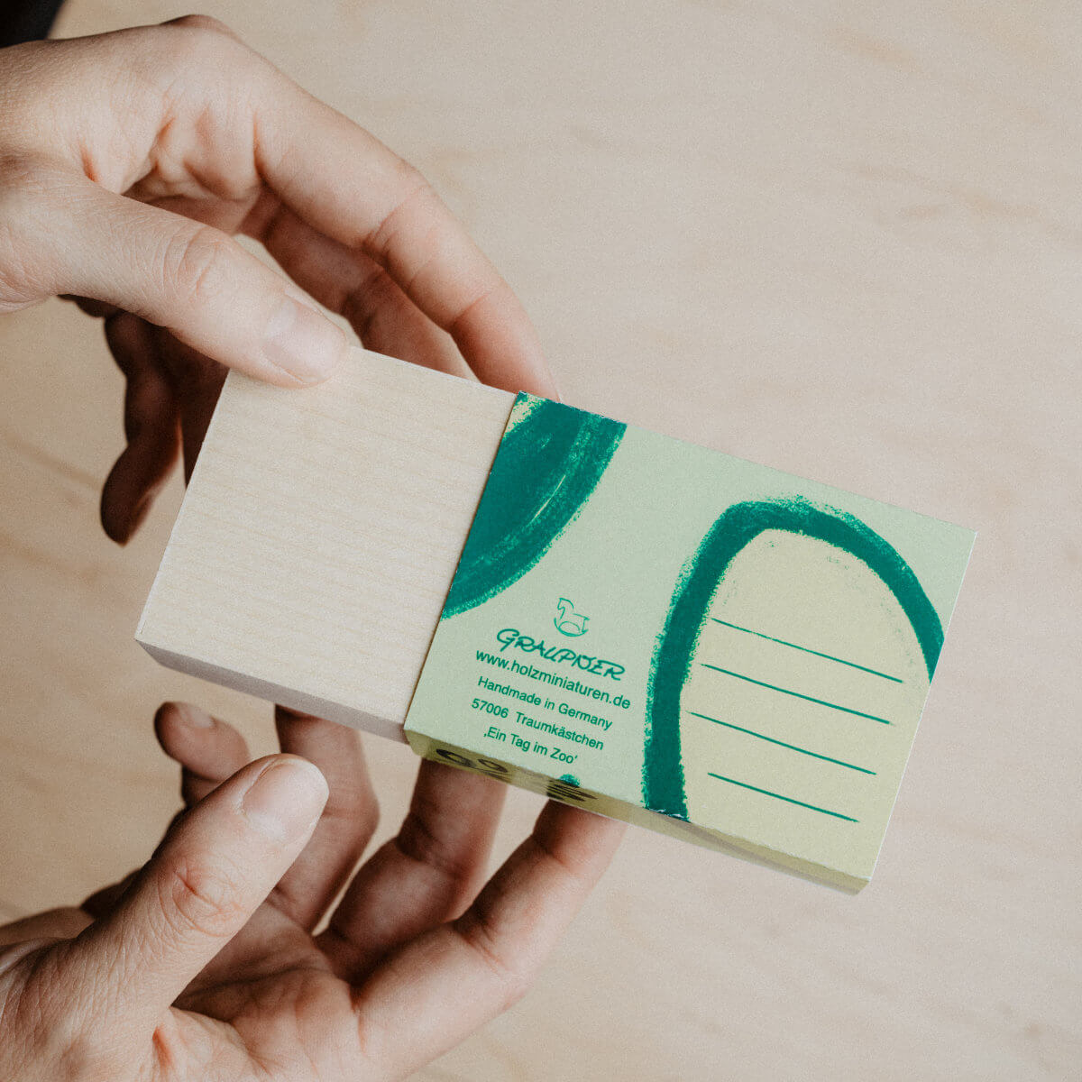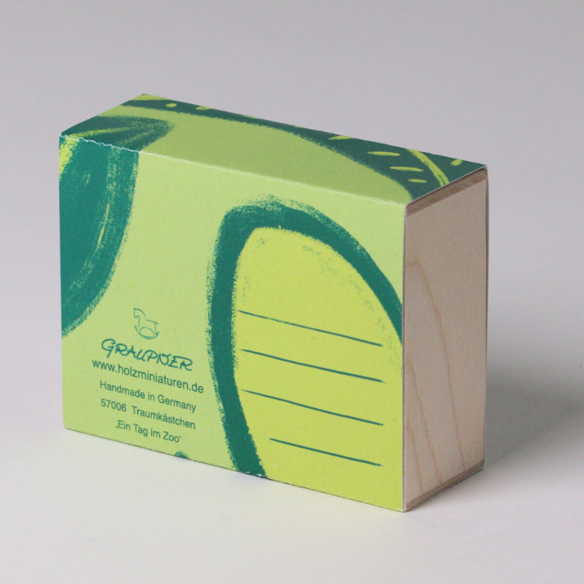 Auffällig leuchtet die Zoo Gutscheinkarte aus Holz. Die Streichholzschachtel Miniatur ist wirklich eine Besonderheit. Auf nur wenigen Zentimetern Größe bietet die Streichholzminiatur „Ein Tag im Zoo“ eine detailreiche Szene mit verschiedenen Tieren. Löwe, Giraffe und Elefant dürfen dabei natürlich nicht fehlen. Schieben Sie die bedruckte Banderole aus kräftigem Papier vorsichtig zu Seite – schon erblicken Sie eine einzigartige Szene, welche in das Kästchen aus Ahornholz gesetzt wurde. Die von einer lokalen Illustratorin gezeichnete Rückwandillustration auf Papier wird aufwendig in die Box kaschiert. Dazu muss jeder Handgriff sitzen! Auf der Rückseite der Banderole findet sich Platz für einen persönlichen Gruß an den Beschenkten.