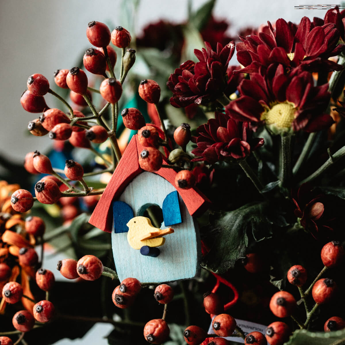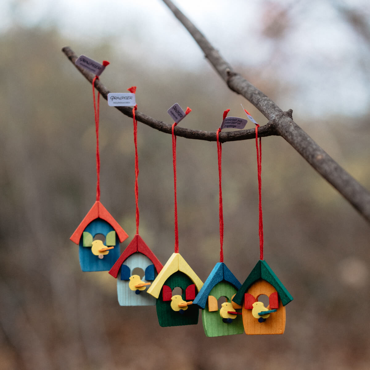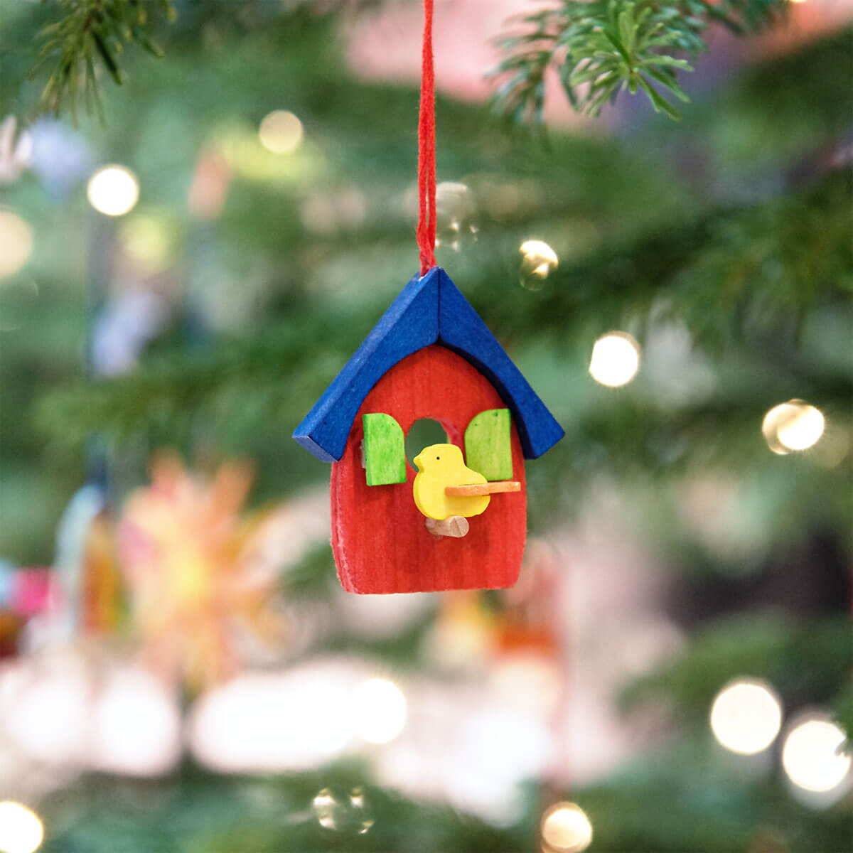 Ganz unterschiedlich bunte Vogelhäuser zählen zu dem farbenfrohen Sortiment. Dieser Baumbehang eignet sich aufgrund seiner Größe nicht nur für den Tannenbaum, sondern auch hervorragend für einen Weihnachtsstrauß oder als Geschenkanhänger auf einem größeren Paket. Aber er lässt sich auch für einen Frühjahrs- oder Osterstrauß herrlich dekorieren – ein echter Alleskönner sozusagen. Der Anhänger ist mit einem roten Faden zum Aufhängen versehen.